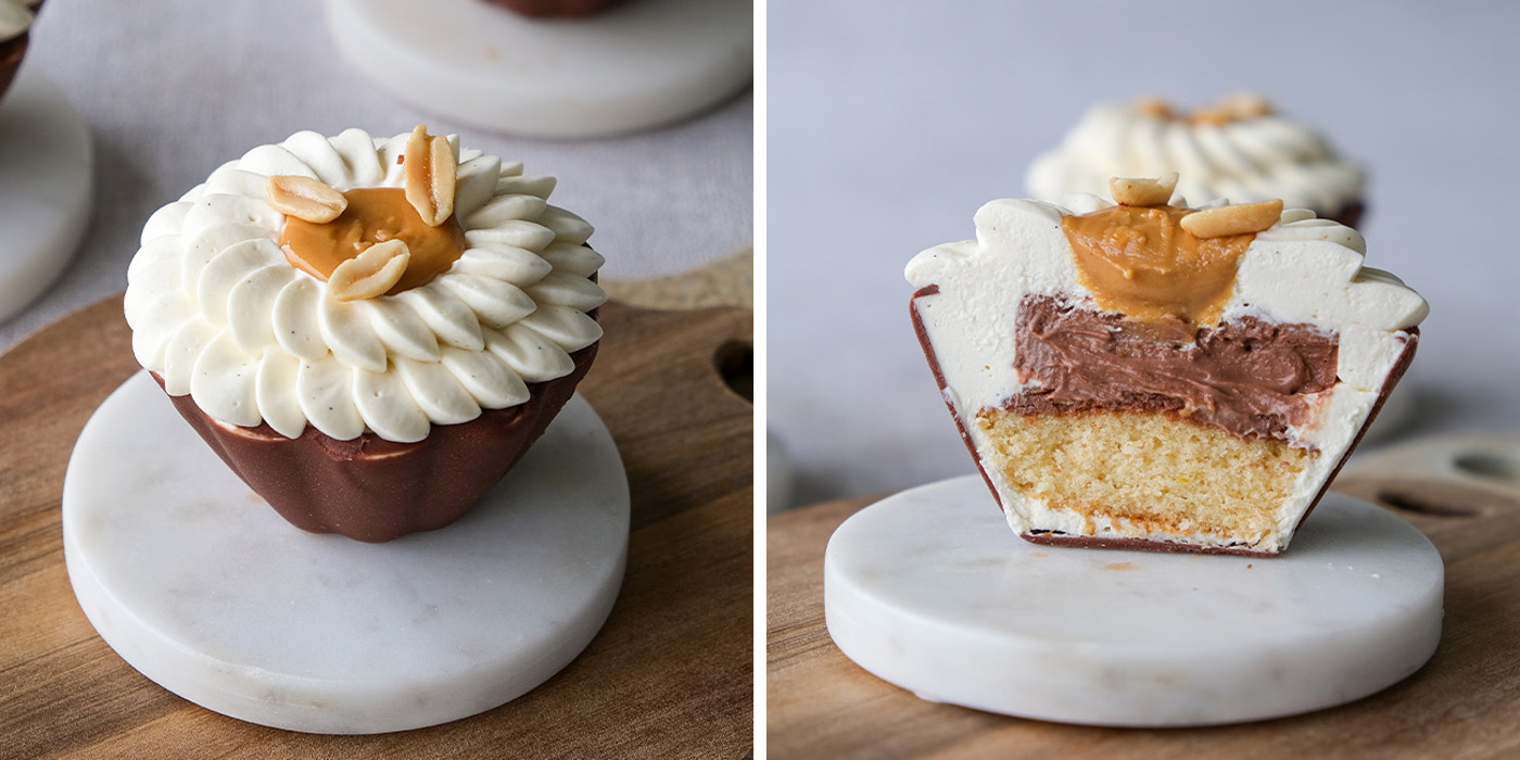 En elegant entremets med blød peanutbund, sprød peanut-crunch og en intens kerne af mørk chokolade. Omsluttet af luftig vanilje-ganache og dyppet i silkeblød chokolade. En lille kage med stor smag – rig, cremet og uimodståelig.