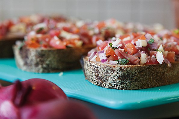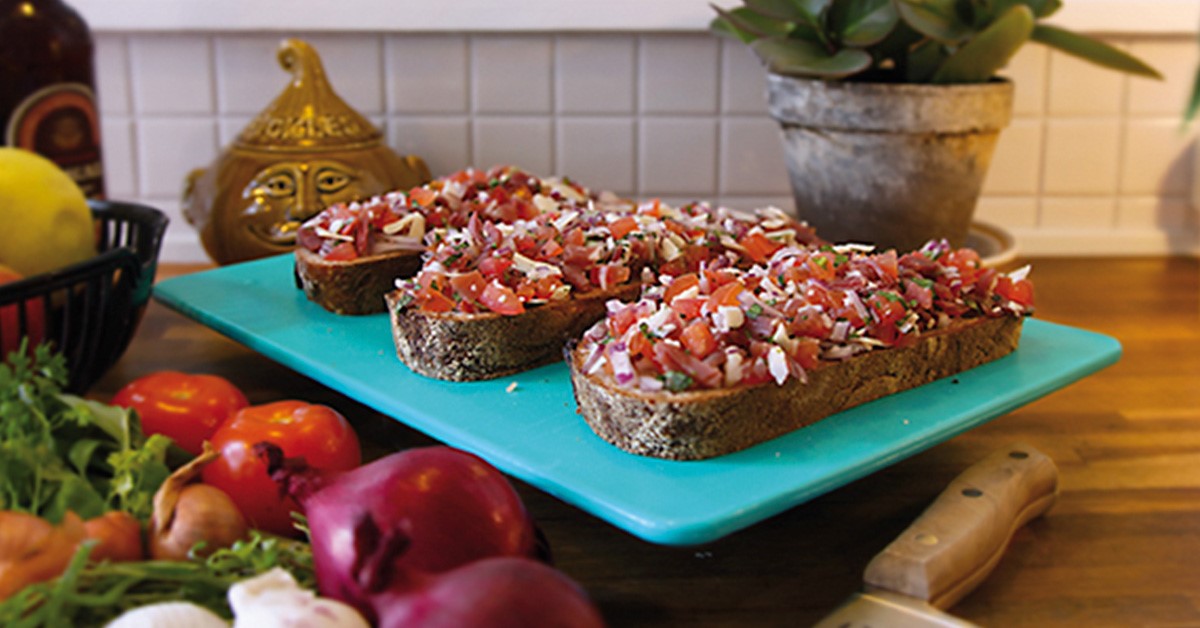 - Herefter er der fri leg for, hvad man ønsker af fyld på sine grillbrød. Vi har valgt at bruge små tern af friske tomater, små tern af syltede rødløg, god parmesanost fra Italien, hvidløg, masser af forskellige krydderurter, friskkværnet sort peber og havsalt.