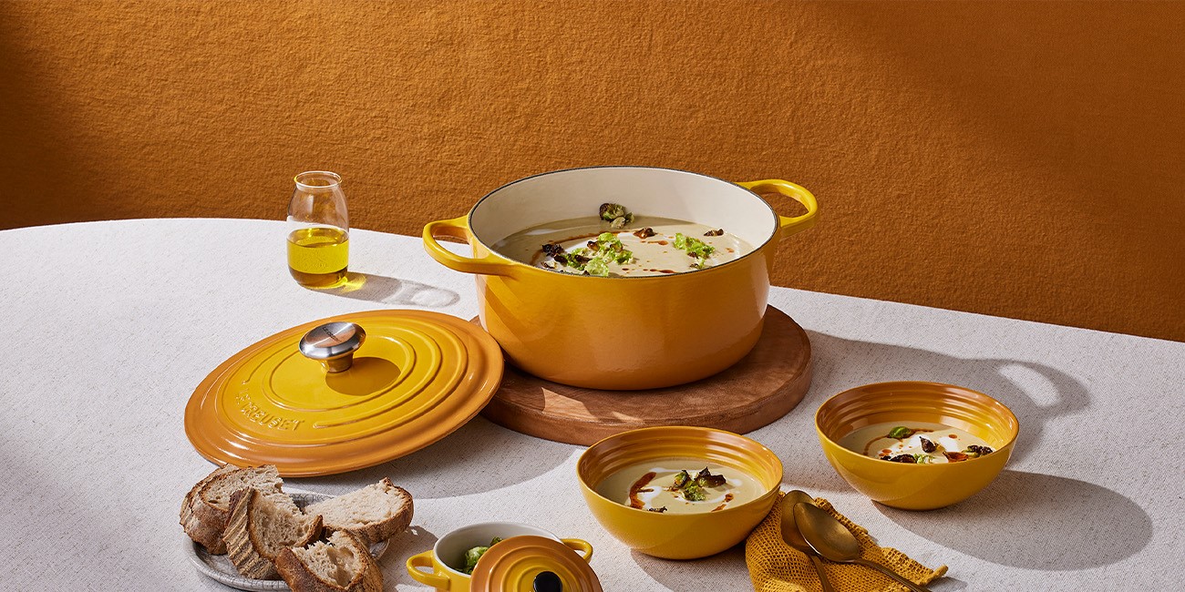 - Til pynt: Fjern bladene fra rosenkålene, læg dem på en bageplade, dryp med olivenolie og krydr med salt og peber. Bag ved 200 °C i 8-10 minutter, til de er gyldne og sprøde. Drys over suppen inden servering.