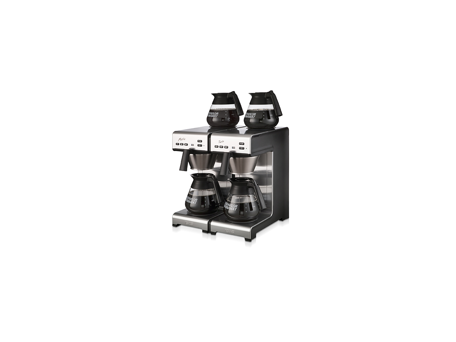 Bonamat Matic Twin er en kraftfuld kaffemaskine i rustfrit stål med automatisk vandtilførsel og en imponerende kapacitet på 24 liter kaffe i timen. Det dobbelte bryggesystem med fire medfølgende kander gør det muligt at brygge store mængder kaffe på kort tid, mens de selvregulerende varmeplader holder kaffen ved perfekt serveringstemperatur.