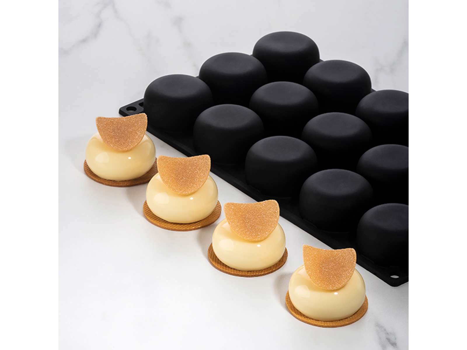 Med en diameter på 50 mm og en højde på 26 mm pr. fordybning sikrer denne form konsistente resultater hver gang. Den sorte silikone giver ikke blot en elegant fremtoning, men har også fremragende non-stick egenskaber, så dine kreationer let slipper formen uden at miste deres detaljer. Materialet fordeler varmen jævnt, hvilket er afgørende for et perfekt resultat, uanset om du arbejder med chokolade, mousse eller bagværk.