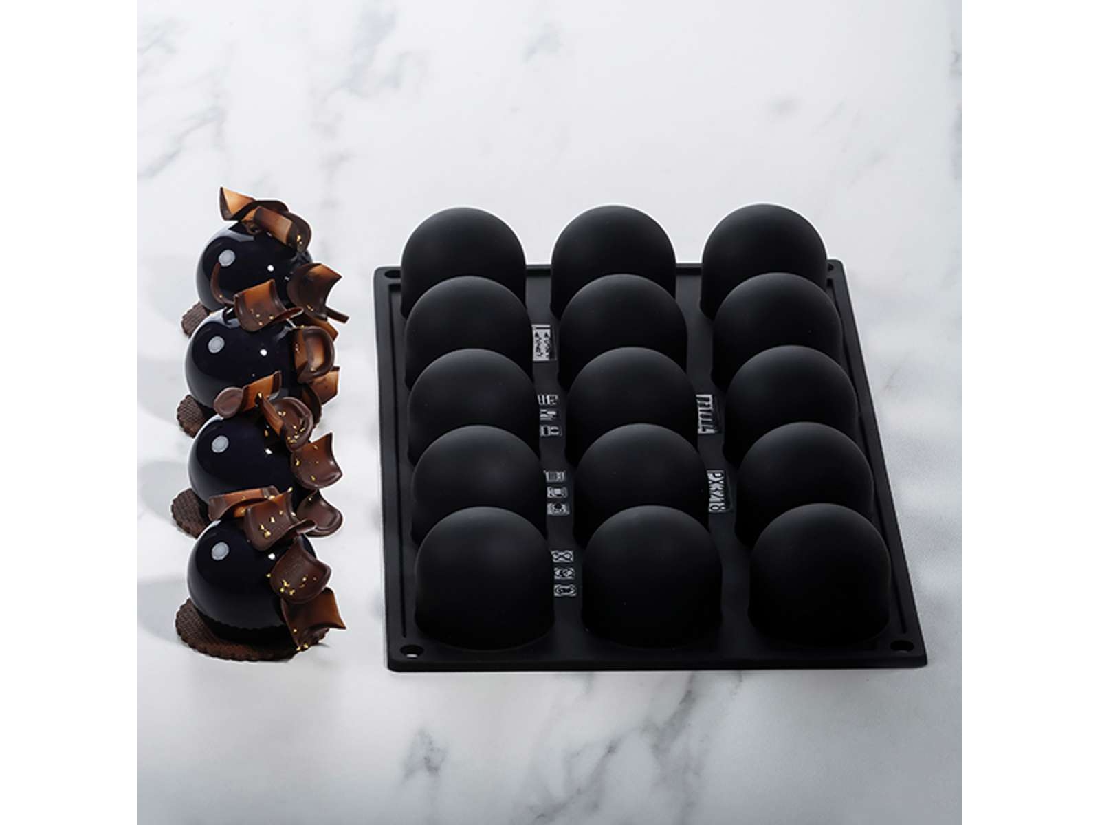 Pavoni Pavoflex Sphere40time er en professionel silikoneform udviklet i samarbejde med den anerkendte konditor Antonio Bachour. Med 15 sfæriske fordybninger på én plade giver denne form dig mulighed for at skabe ensartede, professionelle desserter med præcis samme størrelse og form hver gang. Den sorte silikoneform måler 300x175 mm og har fordybninger med diameter på 43 mm.