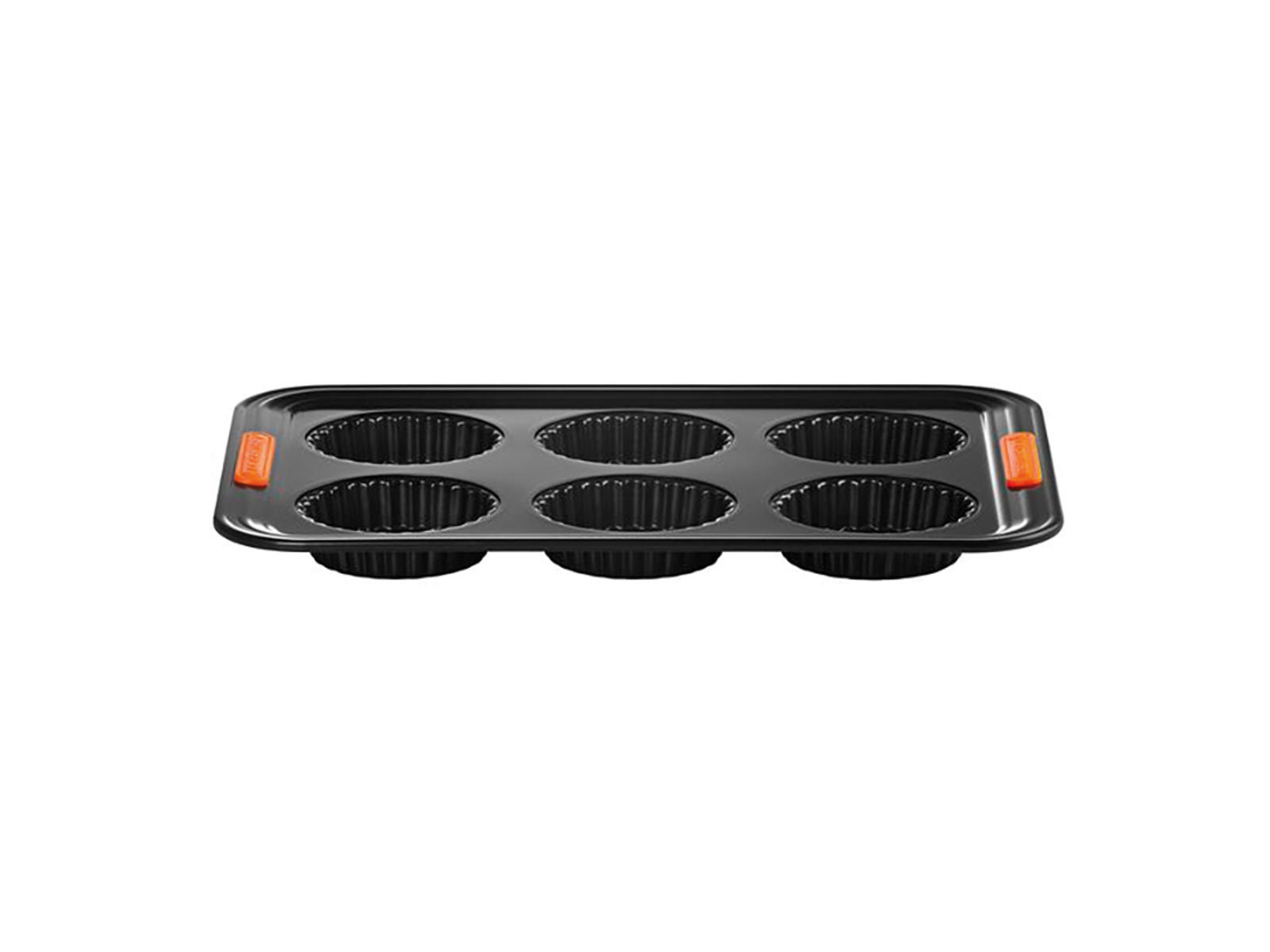 Denne Le Creuset tærtebageplade i sort kulstofstål giver dig mulighed for at bage 6 individuelle tærter samtidig. Med non-stick belægning, varmeresistente silikoneforstærkede håndtag og en jævn varmefordeling sikrer den ensartede, velsmagende tærter med sprød bund.
