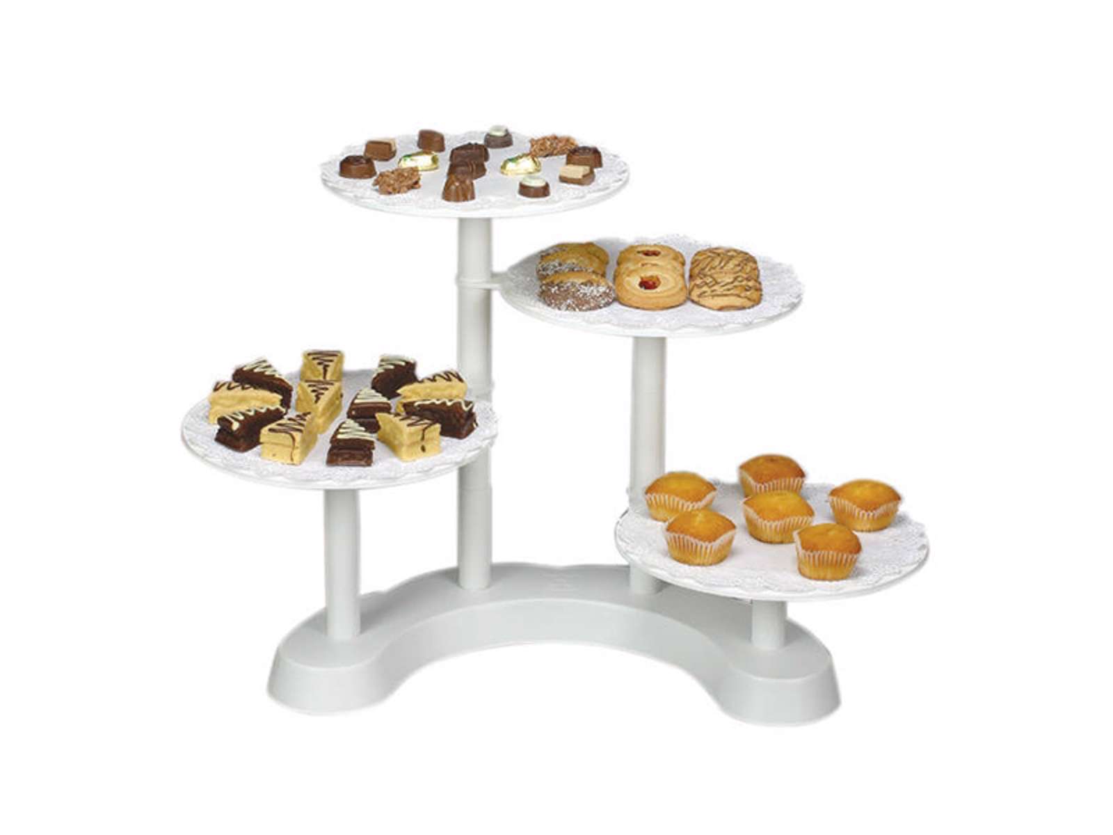 Denne 4-etagers hvide kageopsats fra Schneider giver dig mulighed for at præsentere bagværk på en stilfuld og praktisk måde. Med fire separate niveauer får du god plads til at arrangere forskellige typer kager, cupcakes eller andre søde fristelser, hvilket gør den ideel til både professionelle og private arrangementer.