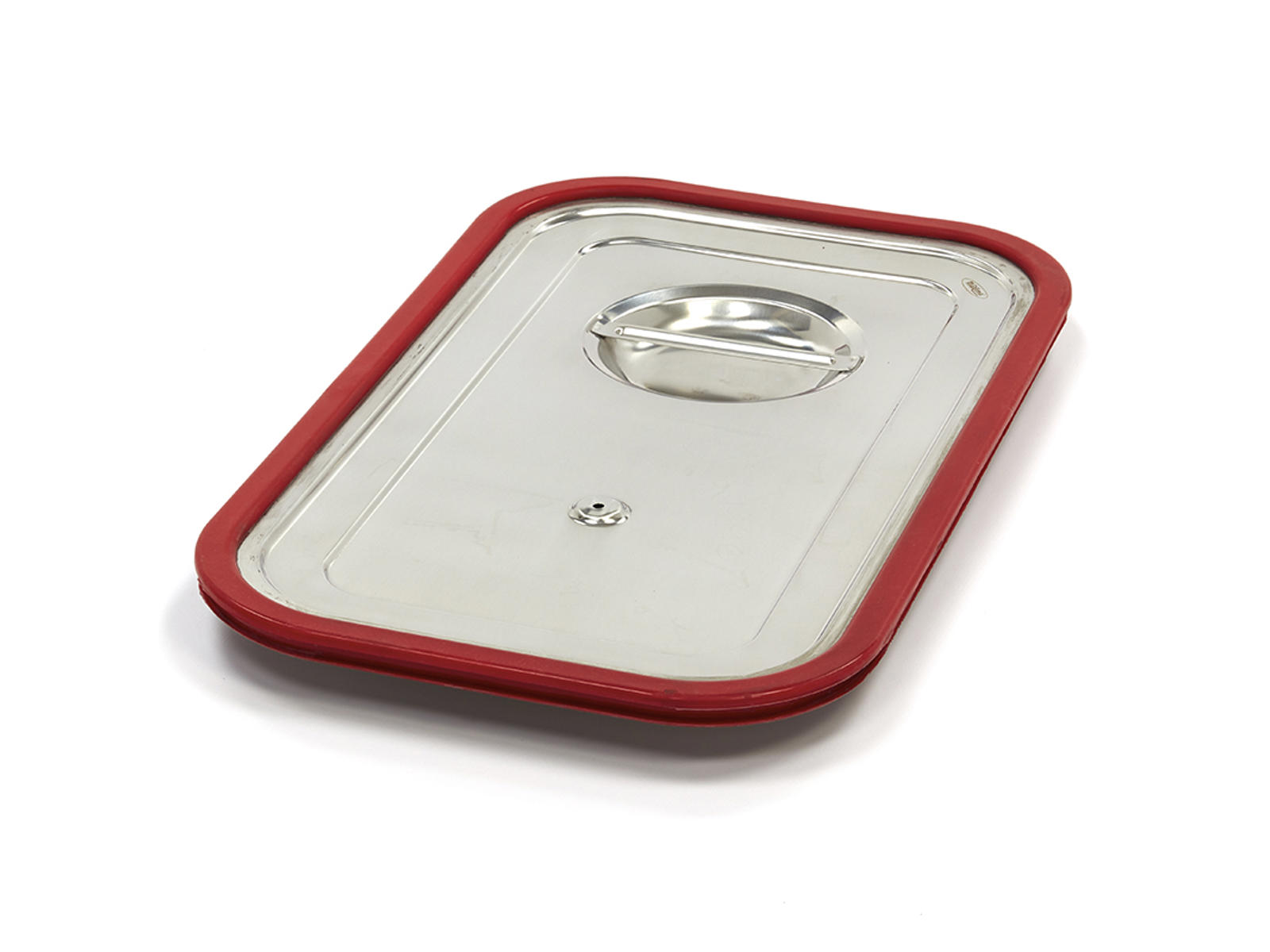 De foldede kanter og afrundede hjørner gør låget sikkert at håndtere selv i travle køkkener. Den stabelbare konstruktion sparer værdifuld plads i både køle- og fryserum samt på hylder. Silikonepakningen skaber en vand- og lufttæt forsegling, der forhindrer spild og krydskontaminering, samtidig med at den bevarer fødevarernes friskhed længere.