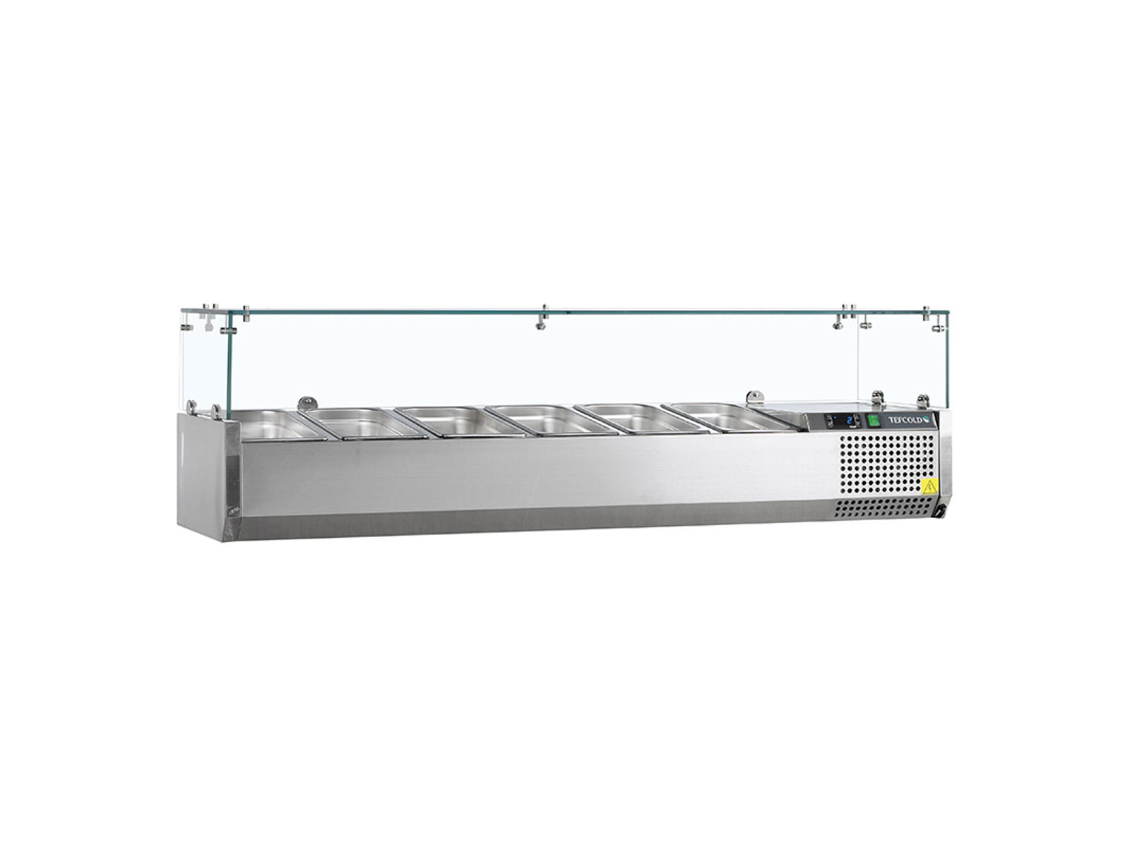 Tefcold GVC38-150 køleopsatsen holder dine ingredienser friske og synlige under en beskyttende glastop. Med plads til 6 GN1/3-kantiner giver den rustfri stålkonstruktion et hygiejnisk og holdbart arbejdsområde, der sikrer optimal opbevaring af toppings og tilbehør. Den digitale temperaturstyring giver præcis kontrol mellem +2°C og +8°C.