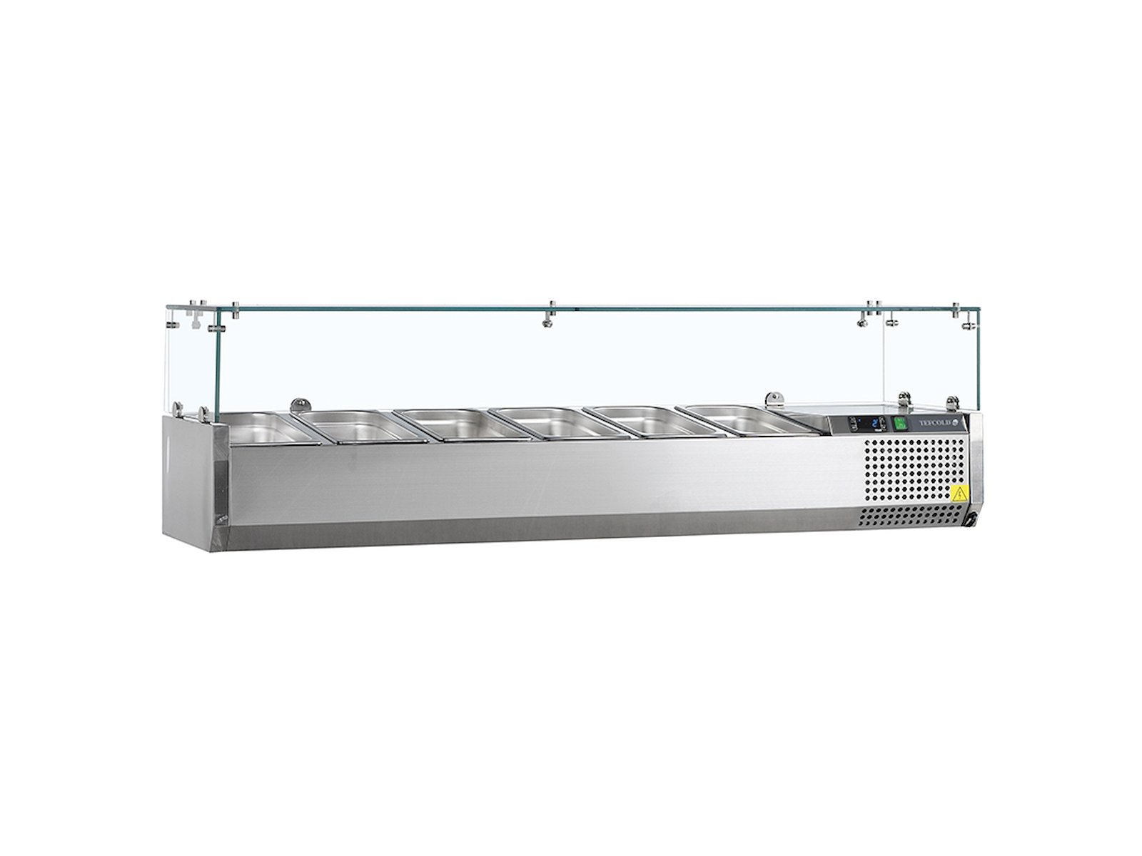 Tefcold VK33-140 er en professionel køleopsats med plads til 6 GN1/4 kantiner og beskyttende glasoverdækning. Den rustfrie stålkonstruktion sikrer holdbarhed, mens den statiske køling holder temperaturen stabil mellem +2°C og +10°C. Med en bredde på 1400 mm passer den perfekt ind i større serveringsområder.