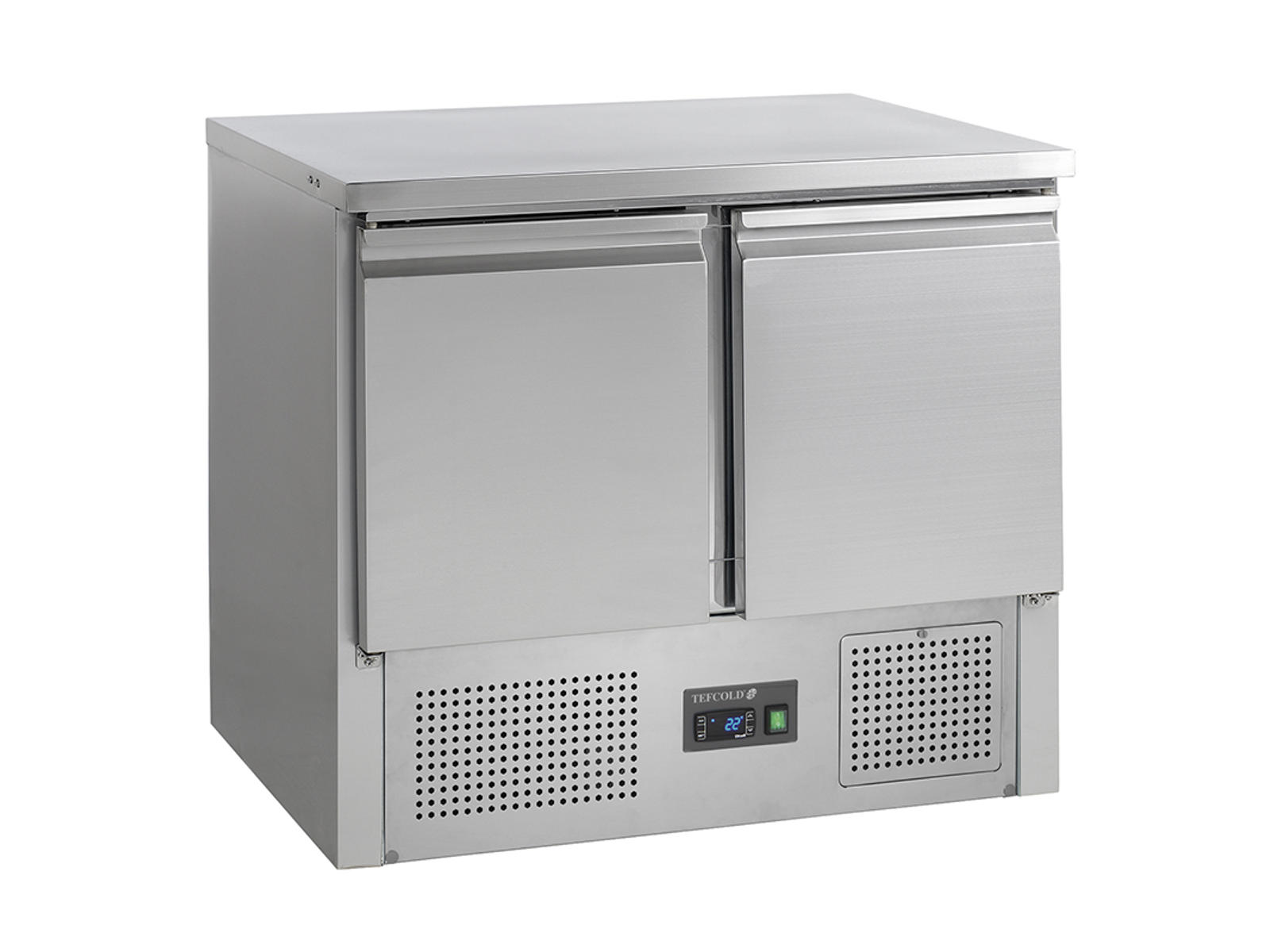 Tefcold SA910 er en kompakt køledisk i GN1/1-format med to separate sektioner og integreret kompressor. Den rustfrie stålkonstruktion kombinerer holdbarhed med professionel funktionalitet, mens den ventilatorassisterede køling sikrer jævn temperaturfordeling i hele kabinettet.