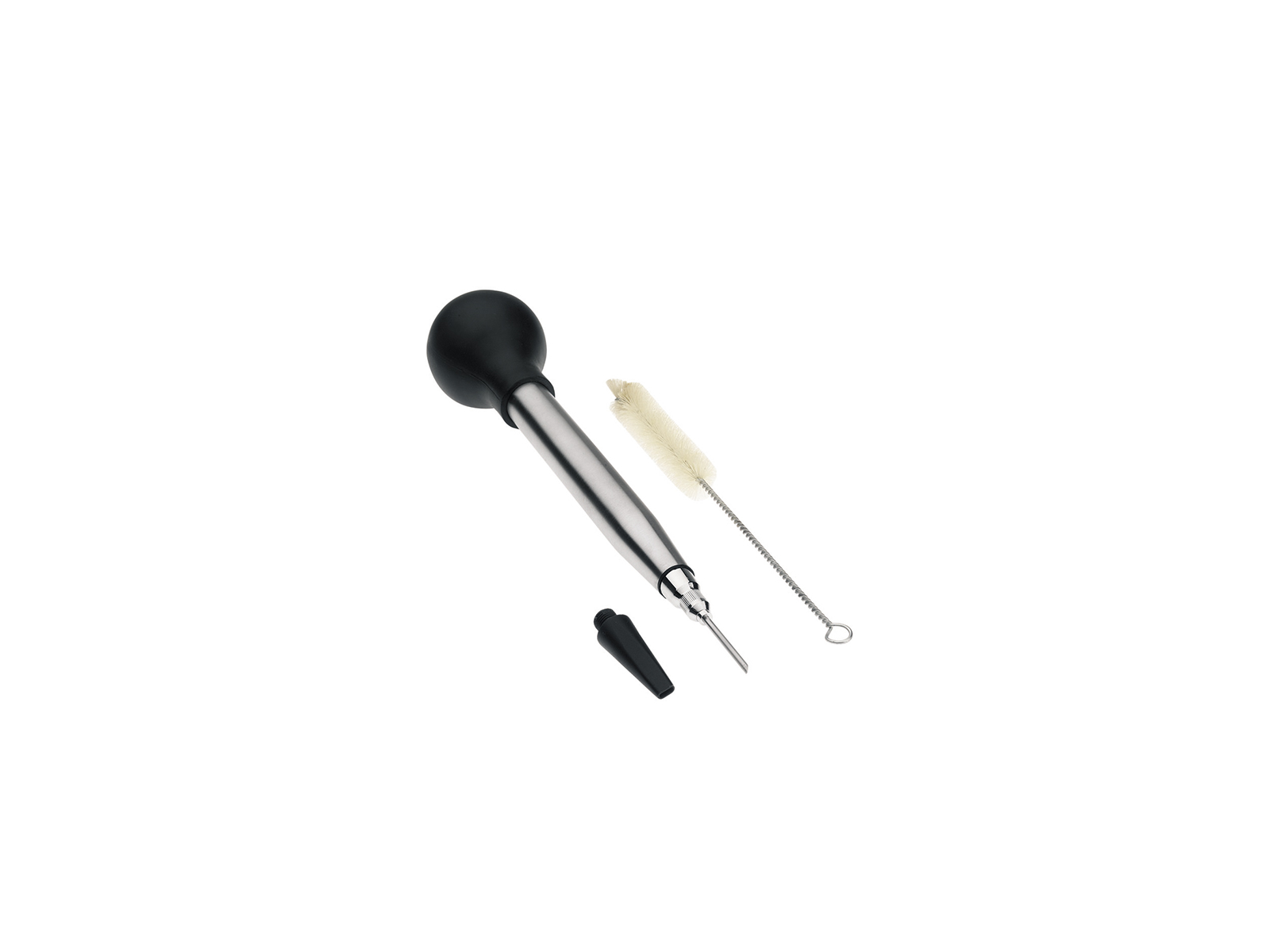 Med en kapacitet på 40 ml giver pipetten dig mulighed for at arbejde med præcise mængder. Den lange form på 30 cm gør det muligt at nå dybt ind i større kødstykker eller retter uden at forstyrre anretningen. Du kan tilføre marinade til midten af en steg, ekstrahere overskydende væske fra en ret, eller dosere nøjagtigt afmålte mængder sauce til tallerkener. Dette giver dig både bedre kontrol over smagen og et mere professionelt udtryk på de færdige anretninger.