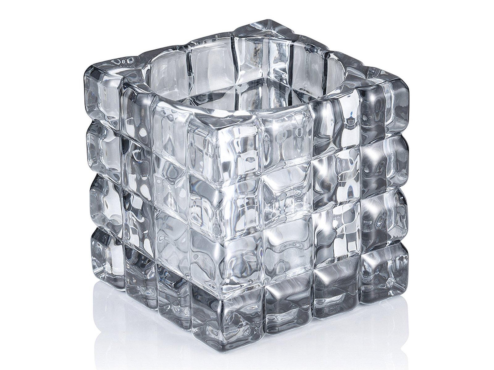 Denne elegante lysestage i røgfarvet glas har en kubisk form med målene 9x9x9 cm, der giver et moderne og stilrent udtryk. Glasmaterialet skaber en smuk lysspredning, når et stearinlys brænder indeni, og den røggråfarvede tone tilfører et sofistikeret præg til indretningen.