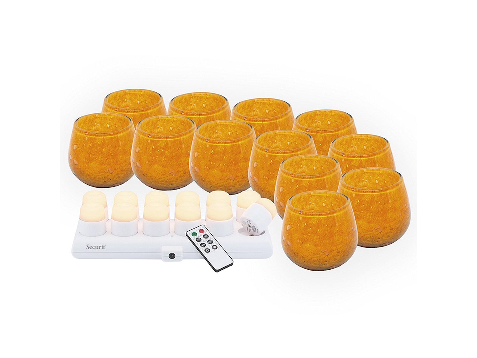 Securit Luna lysestage-sæt giver dig 12 elegante orange lysestager i mundblæst, genanvendt glas, hver med sit eget unikke mønster. Sættet kombinerer klassisk glasdesign med moderne LED-teknologi, så du får smukke, flammeløse lys der skaber stemning uden risiko for brand, røg eller smeltet stearin. Ideel til både indendørs og udendørs brug i restauranter, hoteller eller hjemmet.