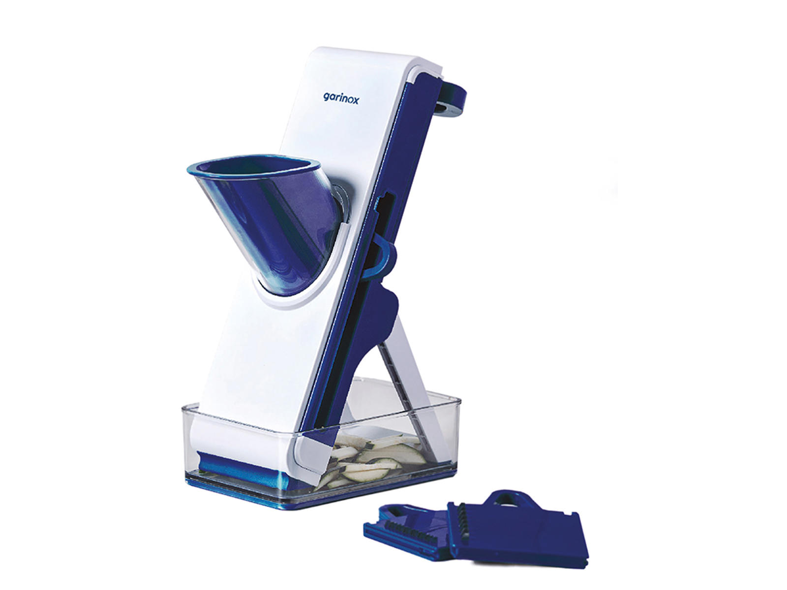 Med denne mandolin får du mulighed for at vælge mellem forskellige skæretyper og tykkelser. De vendbare blade giver dig følgende muligheder: skiver på 2 mm og 4 mm samt juliennestrimler på 4 mm og 8 mm. Dette gør redskabet særdeles anvendeligt til alt fra tynde kartoffelchips til grovere grøntsagsstrimler til wok-retter. Den medfølgende beholder med låg er praktisk til opbevaring af både de udskiftelige knive og de færdigskårne råvarer.