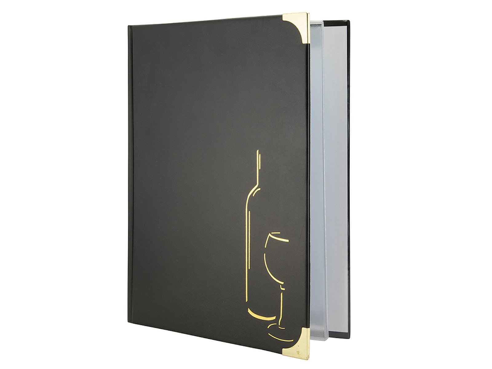 Dette Securit Basic vinkort i sort med læderlook giver din vinliste et stilfuldt og professionelt udtryk. Med gyldent motiv af vinflaske og glas samt beskyttende metalhjørner i guldfarve fremstår vinkortet både elegant og holdbart. Kortet leveres komplet med 4 faste lommer til 8 A4-sider samt 2 praktiske omslagslommer.