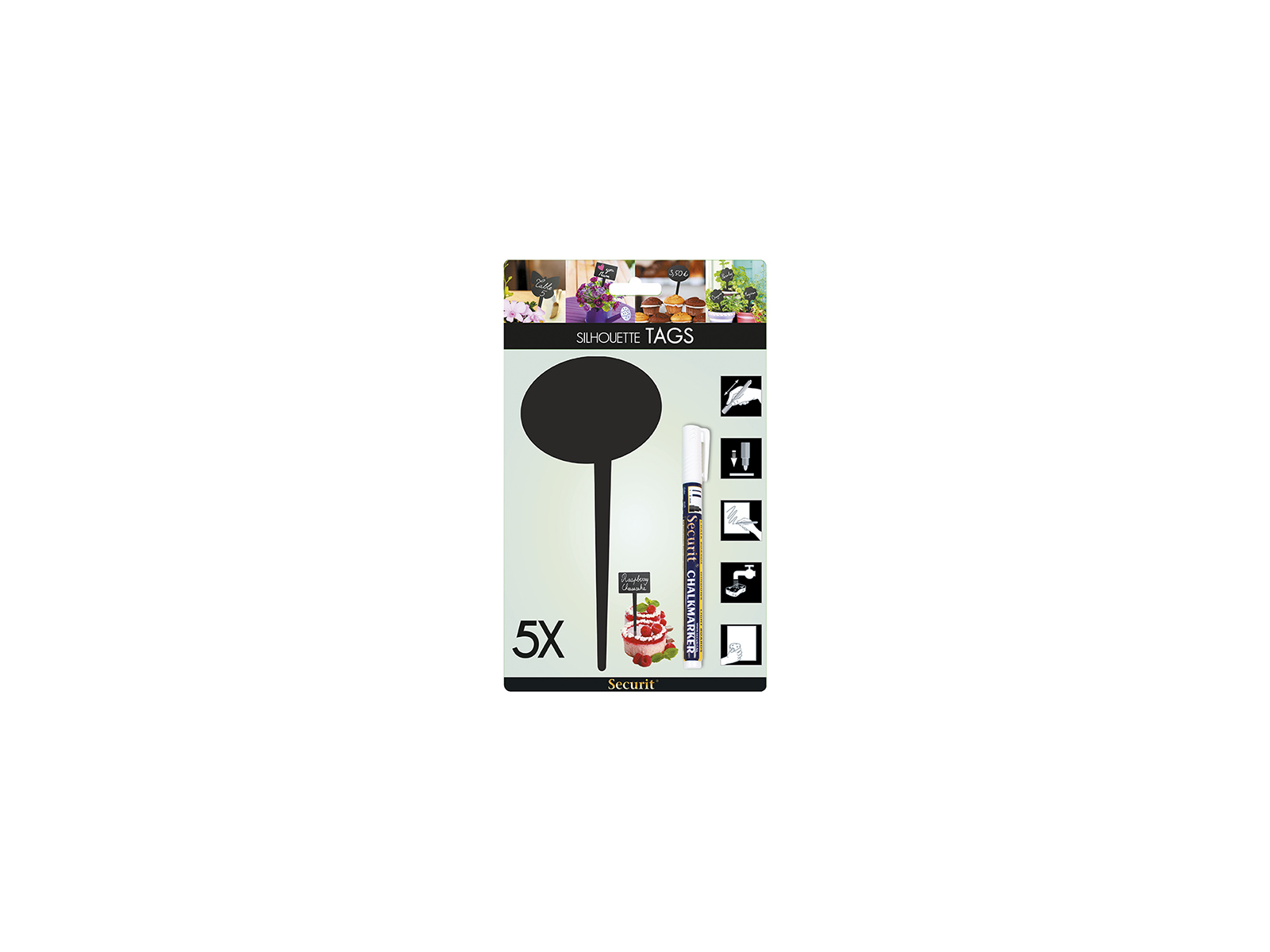 Hver pakke indeholder 5 stk. taleboble-formede prisskilte i sort tavlemateriale. Skiltene måler 18 cm i højden, 8,1 cm i bredden og har en tykkelse på kun 1 cm. Den lave vægt på blot 30 gram per skilt gør dem lette at håndtere og placere. Materialet er fremstillet af holdbar plast, der tåler gentagen brug både indendørs og udendørs. For bedste resultat ved udendørs anvendelse anbefales Securit vandfast kridtmarker.
