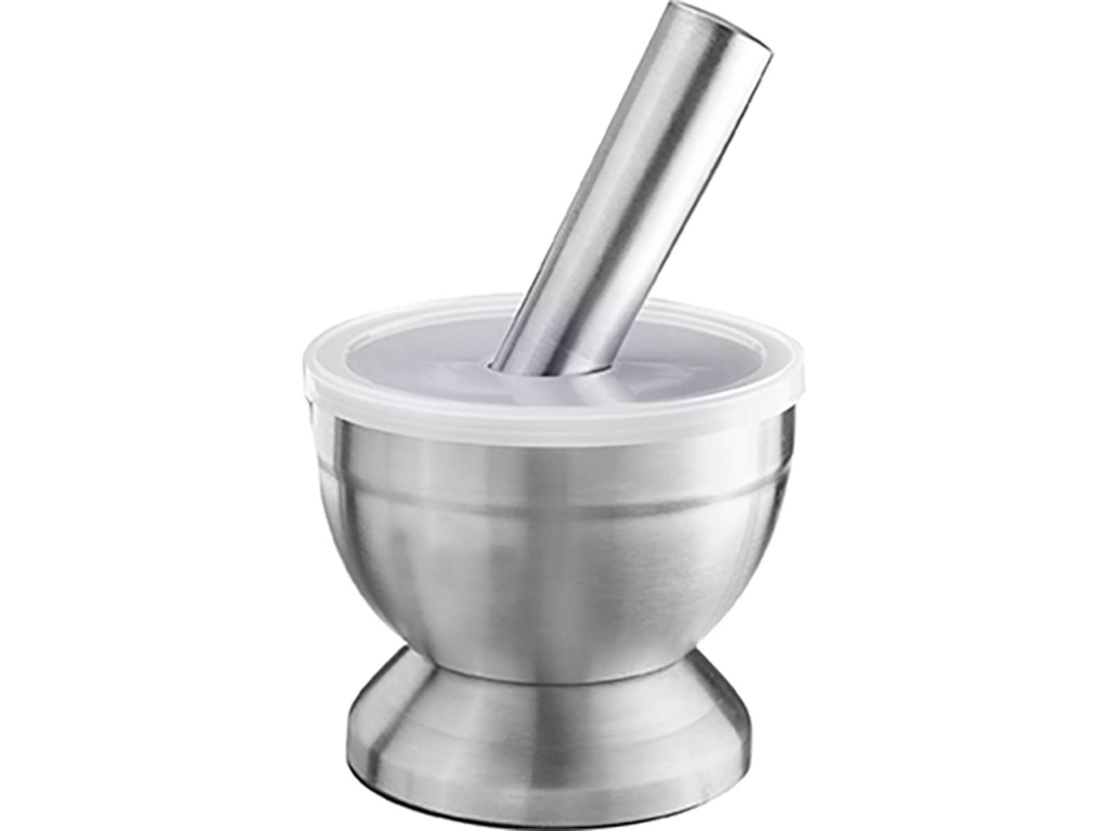 • En holdbar morter i rustfrit stål med praktisk låg