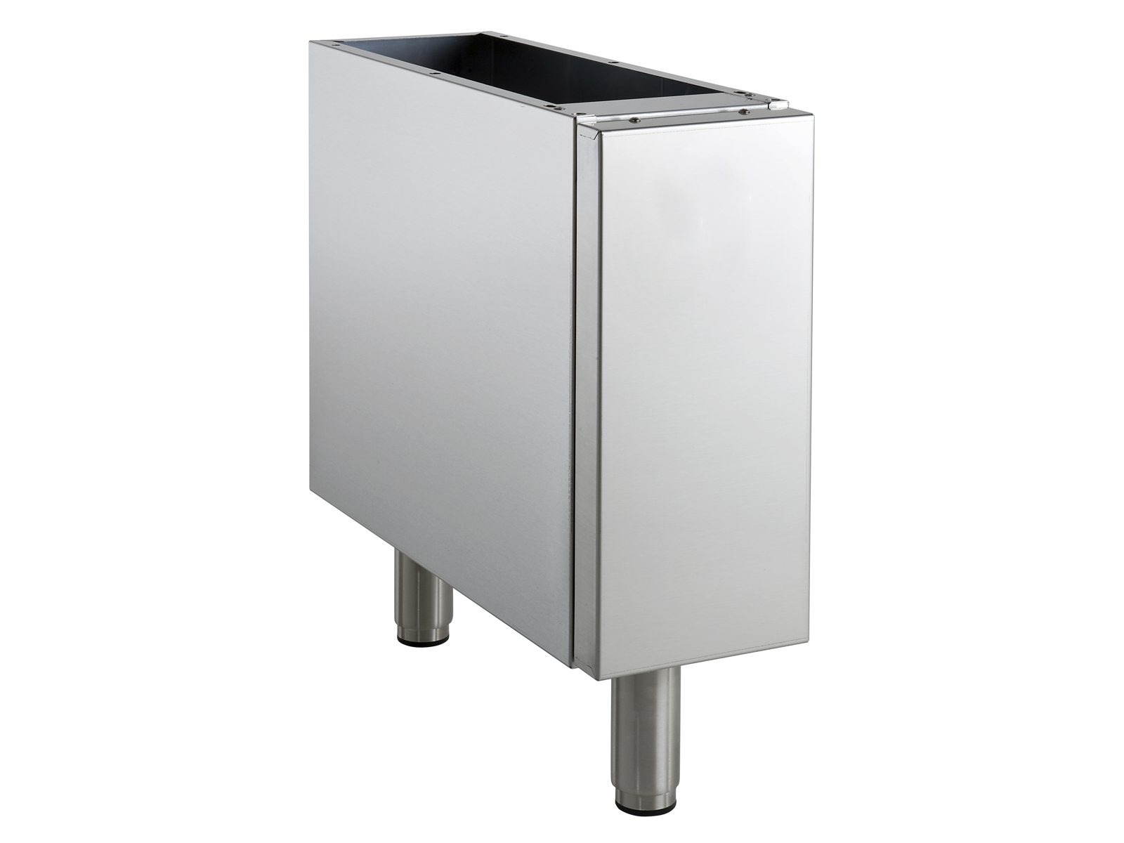 Understellet er fremstillet i holdbart rustfrit stål med Scotch Brite finish, hvilket sikrer lang levetid selv i krævende køkkenmiljøer. De 50mm højdejusterbare fødder i rustfrit stål giver stabilitet på ujævne gulve og hjælper med at skabe en præcis arbejdshøjde. Den lukkede konstruktion beskytter dit udstyr mod støv og snavs, samtidig med at den giver et rent og professionelt udseende i køkkenet.