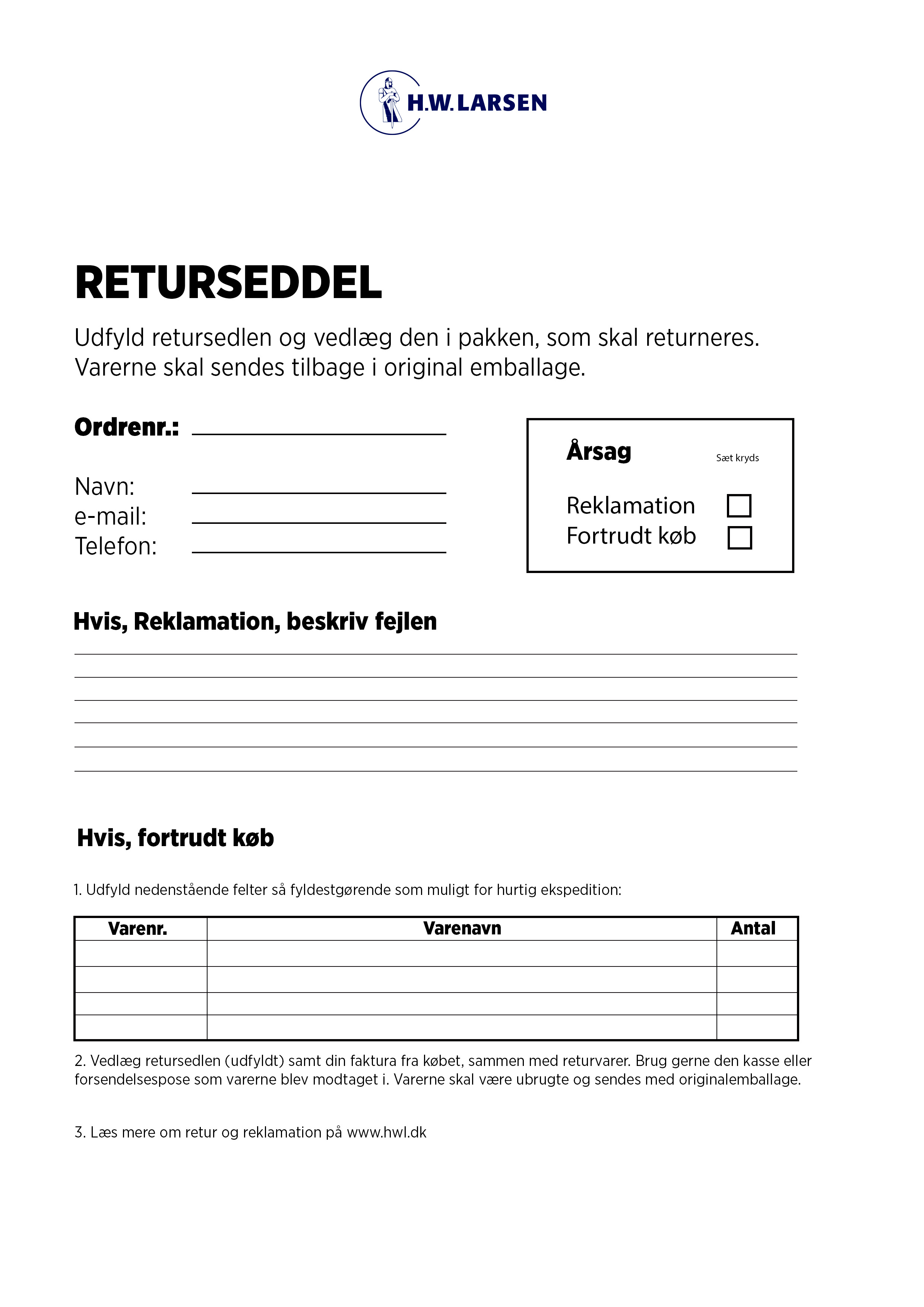 Hvis du vælger at fortryde dit køb, skal du returnere varen i samme stand, som du modtog den. Udprint og udfyld returseddel og vedlæg faktura, så vi kan henføre det returnerede til den korrekte ordre. Køber står selv for at betale returfragten, med mindre der er tale om fejl eller mangel på varen, som kan henvises til leverandøren. I så tilfælde kontaktes H.W.Larsen - Send foto/video af skade/mangel såfremt dette er relevant -  før varen sendes retur, så der kan sendes en returlabel. Gøres dette ikke, vil returneringen være på egen regning.