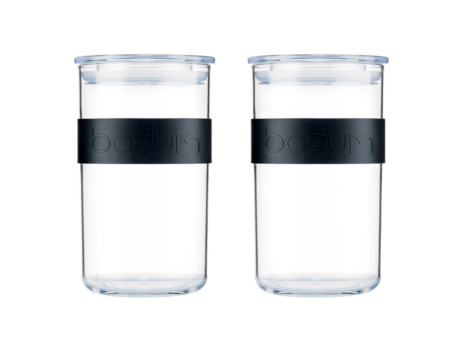 Bodum Presso opbevaringssættet består af to 1-liters beholdere med sorte gummibånd, der kombinerer funktionalitet og stilrent design. De alsidige beholdere er fremstillet i holdbar plast med silikone-gummibånd, der sikrer tæt lukning. Beholderens 1-liters kapacitet gør den velegnet til mange typer fødevarer og rester.