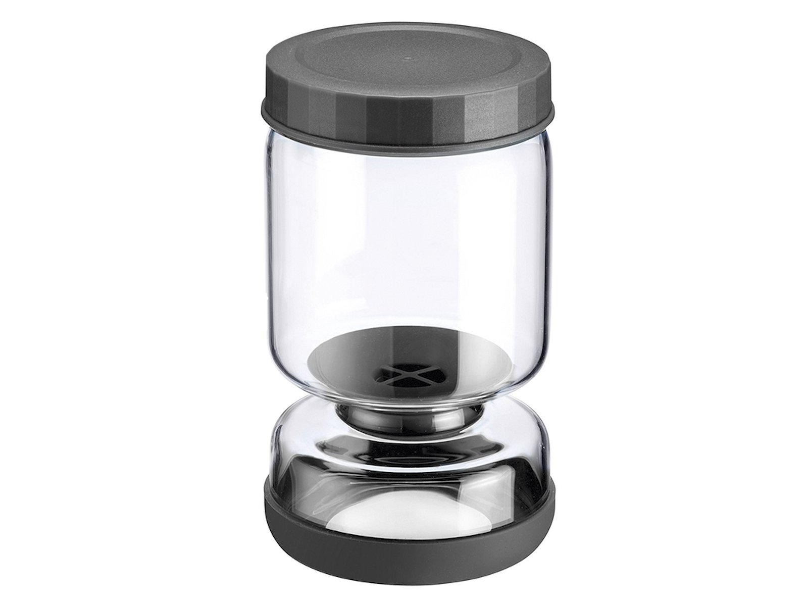 Opbevaringsglasset måler 190 mm i højden med en diameter på 105 mm. Det rummer 900 ml og er fremstillet af borosilikatglas med dele i silikone og PP-plast (BPA-fri). Låget er tætsluttende, og sien er let at tage ud for grundig rengøring. Den sorte farve giver et elegant udtryk, der passer ind i ethvert køkken.