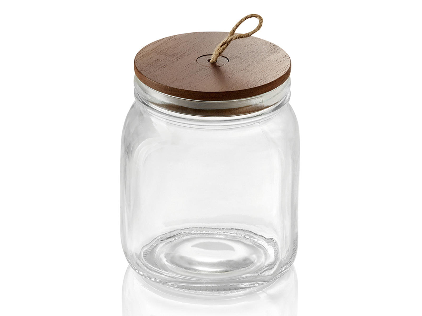 Dette WAS opbevaringsglas har et volumen på 0,65 liter og måler 90x90x120mm (BxDxH). Fremstillet i fødevaregodkendt glas med en vægt på 580 gram. Låget er produceret i naturligt træ, der komplementerer det transparente glas perfekt og giver et rustikt, men tidløst udtryk til dit køkken eller spisekammer.