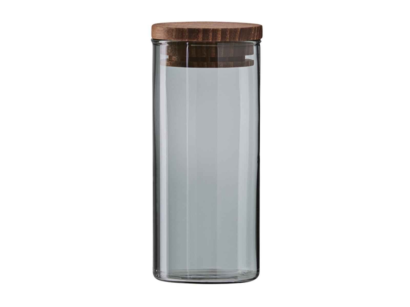 Det røgfarvede glas giver et sofistikeret udtryk og lader dig samtidig se indholdet, så du altid ved, hvad der er i beholderen. Trælåget lukker tæt og sikrer, at indholdet holdes friskt og beskyttet. Den kompakte størrelse gør glasset let at placere på hylder, i skabe eller fremme på køkkenbordet uden at optage unødig plads.