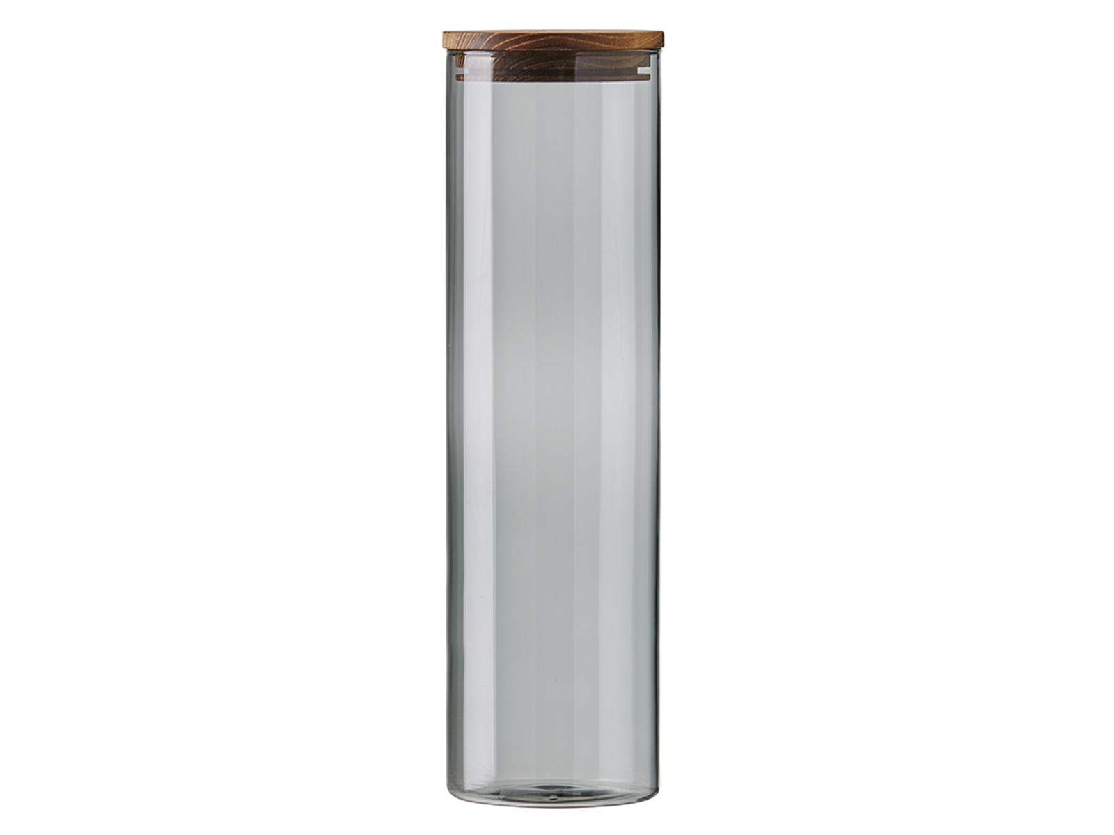 Dette Aida RAW opbevaringsglas har en kapacitet på 1,35 liter, måler 28 cm i højde med en diameter på 8 cm. Den røgfarvede tone skaber en diskret transparens, der lader dig se indholdet uden at det dominerer visuelt. Materialet er kvalitetsglas med et trælåg, der kompletterer det naturlige udtryk.