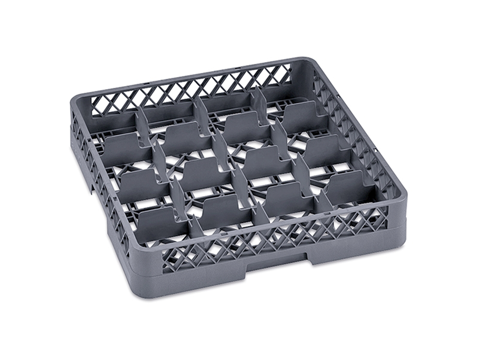 Opvaskebakken måler 500x500x100mm, hvilket er standardmål for professionelle opvaskemaskiner. Den er fremstillet i holdbar polypropylen i en neutral grå farve. Med sine 16 rum er bakken specialdesignet til glas og kopper af forskellige størrelser. Konstruktionen sikrer, at vand og sæbe når alle overflader under vaskeprocessen, hvilket giver et optimalt vaskeresultat hver gang.