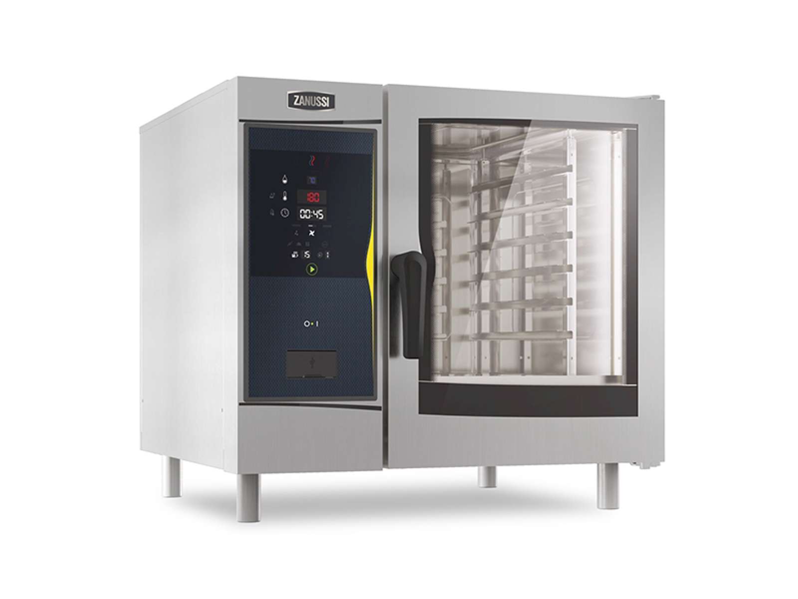 SkyClean automatisk rengøringssystem med integreret afkalkning af dampgeneratoren reducerer driftsomkostninger og nedetid. Vælg mellem fem forskellige rengøringscyklusser afhængigt af tilsmudsningsgraden. Den dobbelte termorude med svinghængslet indvendigt glas kan frigøres for nem rengøring, og den åbne rammekonstruktion holder den udvendige dørplade kølig for øget sikkerhed i køkkenet.