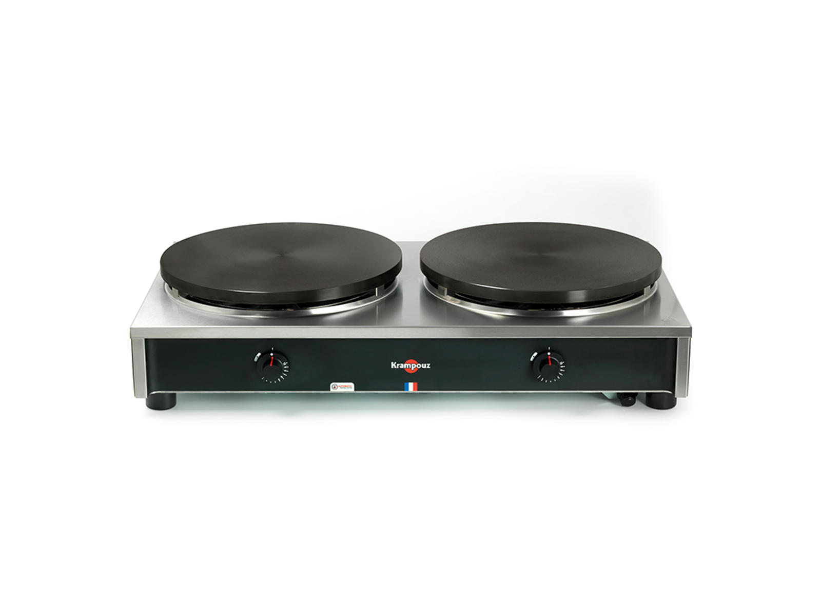 Denne professionelle gaspandekageplade med Ø40 cm diameter kommer i et praktisk sæt med 2 enheder, hver med 6500W effekt. Pladerne er fremstillet i robust støbejern med en speciel overflade designet til optimal varmefordeling og er udstyret med termostatstyring, der automatisk regulerer flammehøjden.