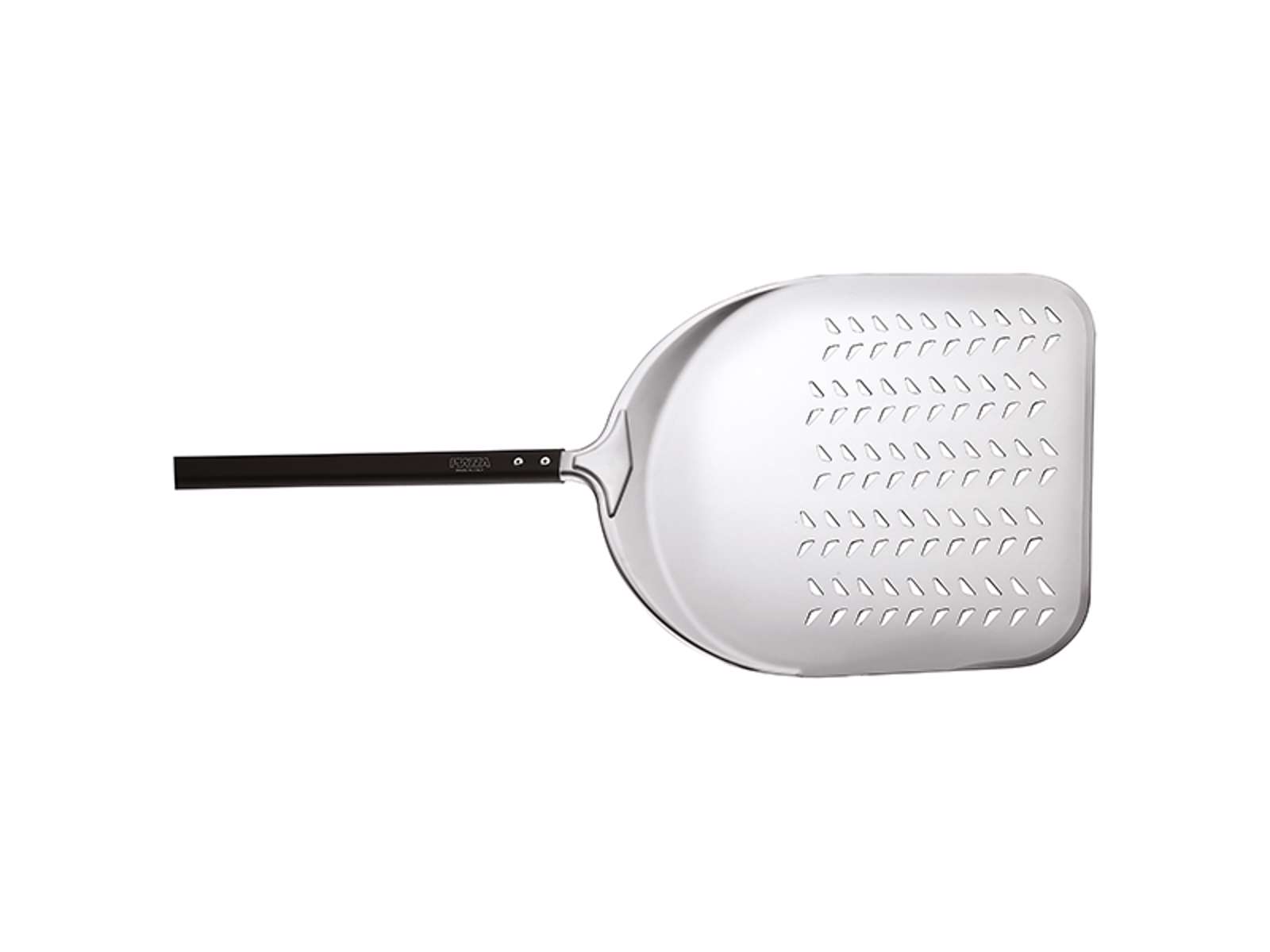 Den perforerede aluminiumsskovl er designet med riller og skråninger på tre sider, hvilket giver bedre greb om pizzaen og mindsker risikoen for, at den glider af under håndteringen. Forstærkningsribberne på bagsiden af bladet giver en perfekt balance mellem letvægt og styrke, så du kan arbejde effektivt selv i travle perioder. Det sorte anodiserede aluminiumsskaft er forbundet til bladet med en støbt aluminiumskerne, sikret med rustfrie stålriveter for maksimal holdbarhed.