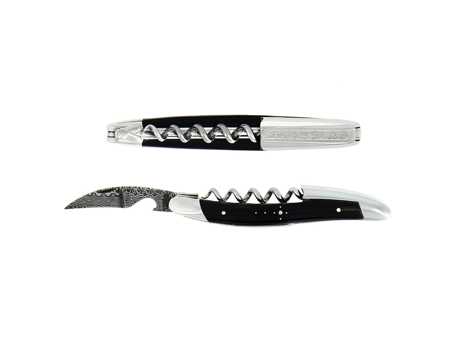 Denne tjenerproptrækker fra Forge De Laguiole vejer kun 90 gram og måler 120 mm i lukket tilstand og 220 mm når den er åben. Den er udstyret med en lille foldekniv til at skære folie, en proptrækker med løftemekanisme for effektiv og kontrolleret åbning, samt en integreret oplukker. Materialerne omfatter Damascus rustfrit stål og eksklusivt sort bøffelhorn, der giver et unikt udseende og godt greb.