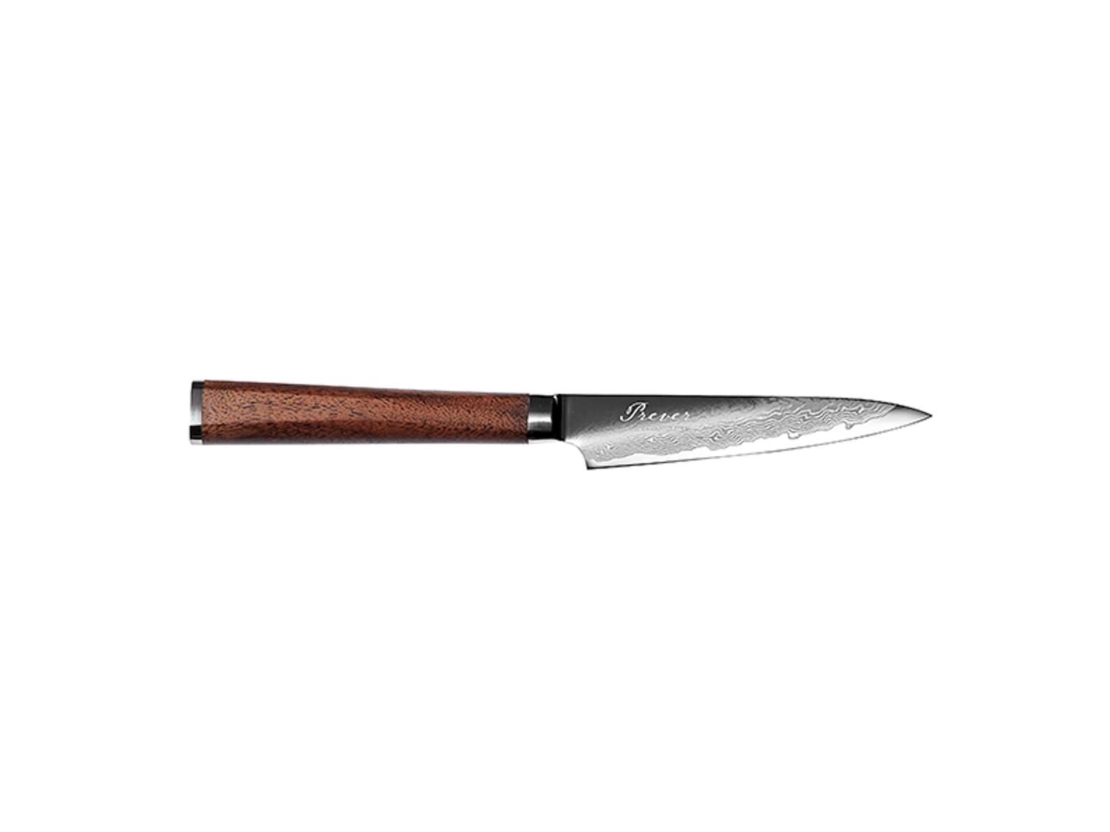 Denne pyntekniv fra Prever-serien er fremstillet med en kerne af VG10-stål omgivet af 67 lag damaskusstål, hvilket giver en exceptionel hårdhed på 60 HRC. Med en bladlængde på 105 mm og en vægt på kun 52 gram er kniven perfekt afbalanceret med det smukke håndtag i canadisk sort valnød. Kniven er håndlavet i Japan efter århundreders traditionelle smedeteknikker.