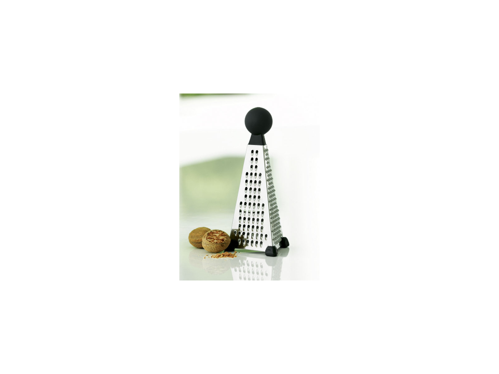 Fremstillet af rustfrit stål med silikonefødder for stabilitet. Dimensioner: 13 cm høj med en base på 6 x 6 cm. Vægten på kun 40 gram gør redskabet let at håndtere. Designet med tre forskellige riveflader: fin, grov og skære. Fra Steel-Function, et skandinavisk brand med over 60 års erfaring i køkkenudstyr.