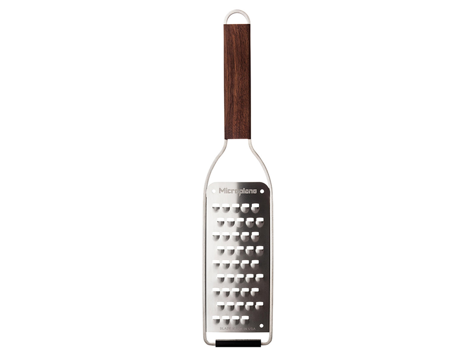 Microplane Master rivejern med ekstra grov riveflade kombinerer præcision og effektivitet i ét professionelt køkkenredskab. De fotoætsede barberbladsskarpe skær i rustfrit stål sikrer rene snit uden at flå råvarerne, hvilket bevarer både aroma og smag i dine ingredienser. Med en vægt på 325 gram og et ergonomisk greb i valnøddetræ ligger det stabilt i hånden under brug.