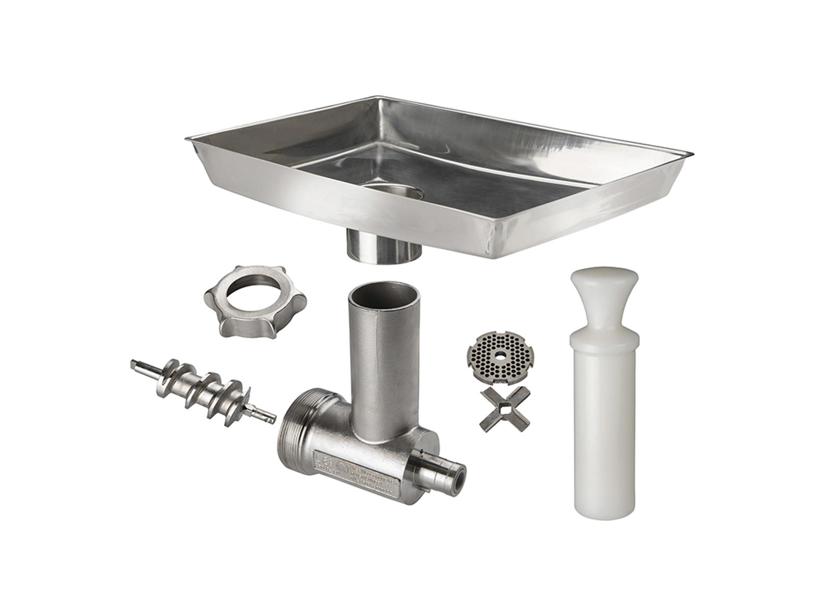 Kødhakkeren leveres komplet med kniv, hulskive og indføringsrør, så du kan begynde at bruge den med det samme på din Teddy AR5 røremaskine.