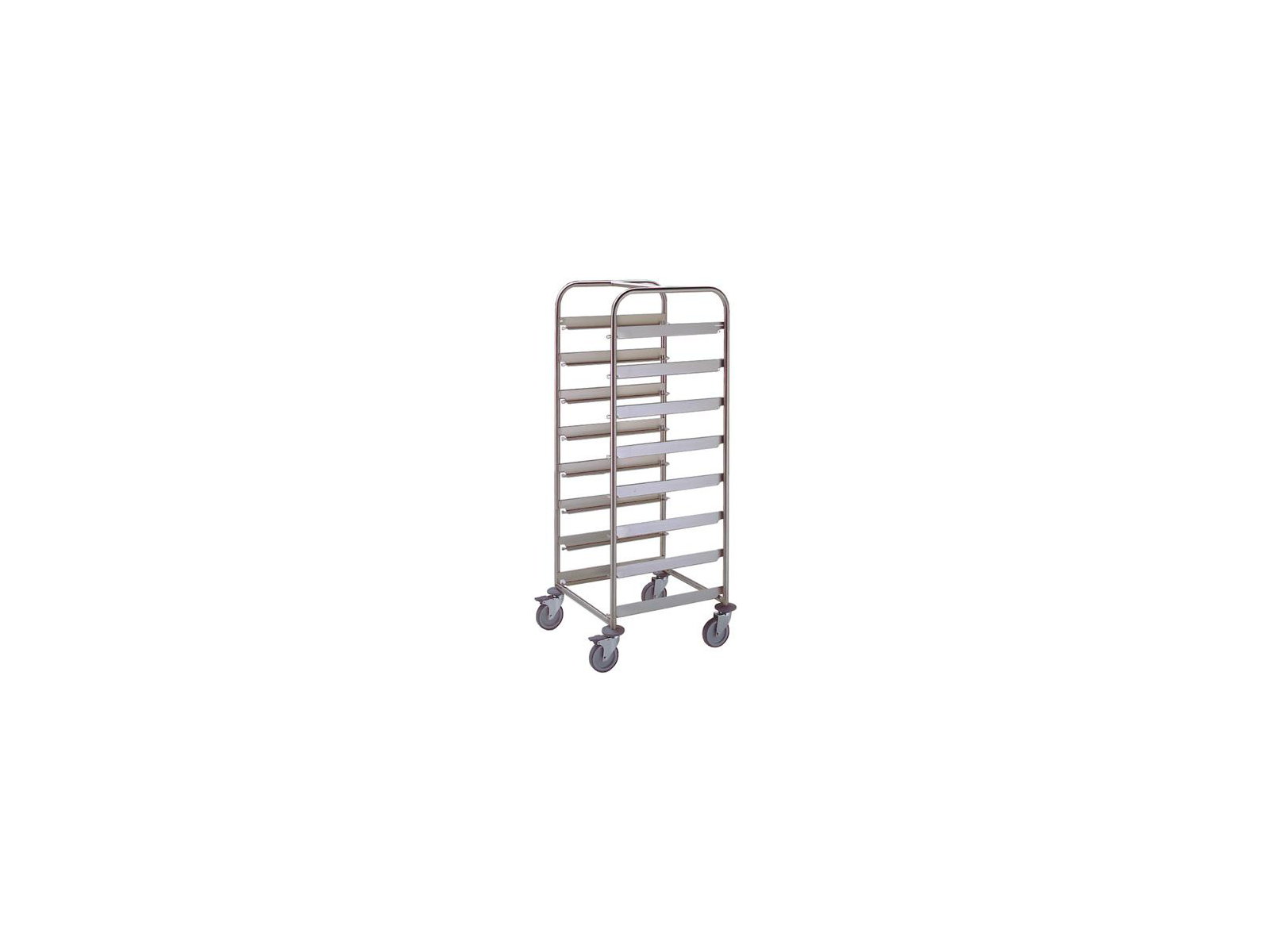 Med plads til 8 kurve og L-formede bæreskinner med opstandere i begge ender sikrer denne vogn, at dit udstyr transporteres sikkert uden at glide af. Det ergonomiske håndtag gør det nemt at styre vognen, selv gennem smalle passager. Den rustfrie stålkonstruktion er ikke kun holdbar, men også hygiejnisk og let at rengøre, hvilket er afgørende i fødevaremiljøer, hvor renlighed er et ufravigeligt krav.