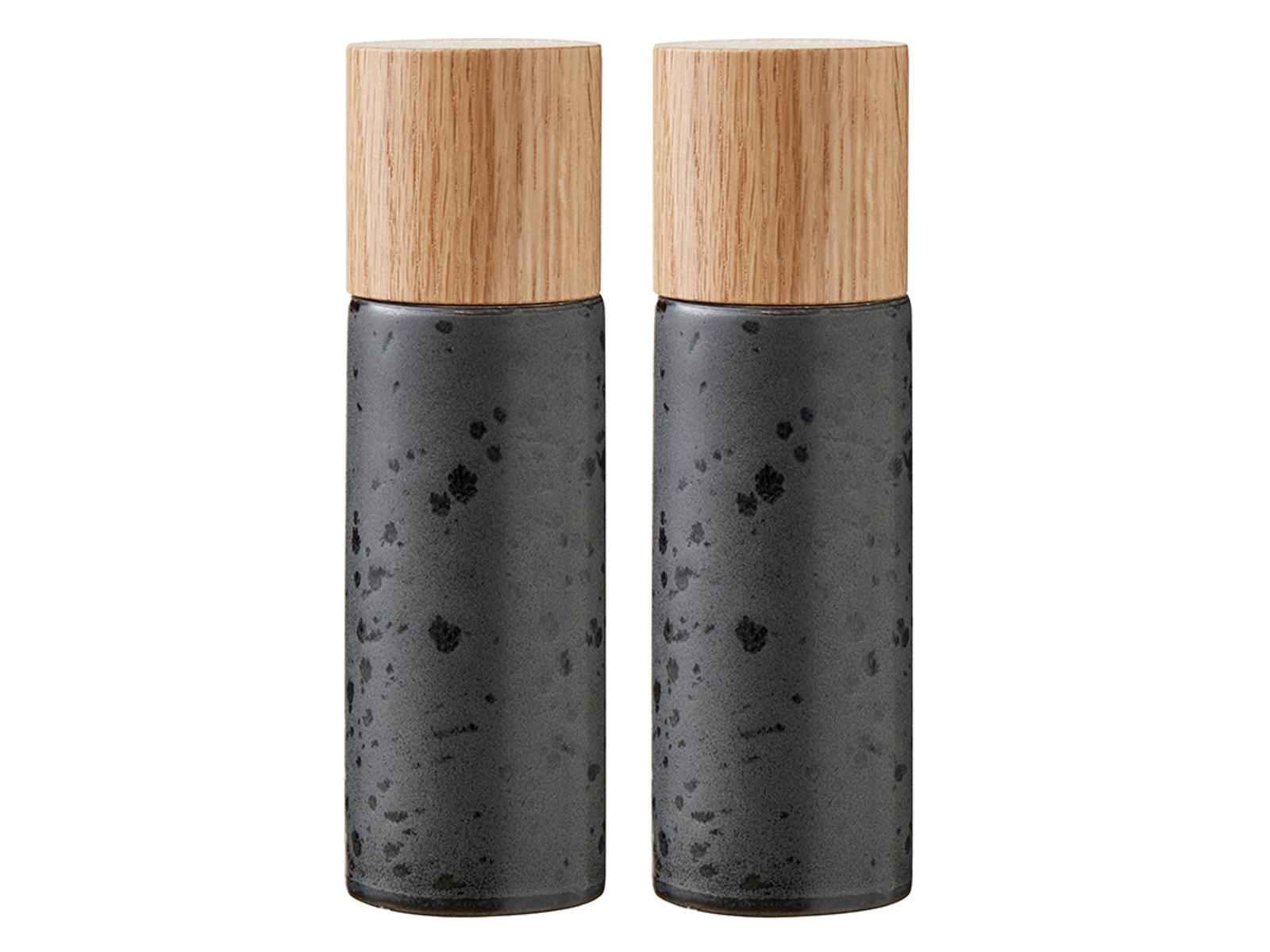 Dette eksklusive salt- og peberkværnsæt fra BITZ er udført i sortglaseret stentøj med elegante topper i egetræ. Med en højde på 17 cm er kværnene designet i en praktisk størrelse, der både giver god funktionalitet og tilfører et stilrent udtryk til borddækningen. Den matte sorte reaktive glasur giver hvert enkelt produkt et unikt udtryk.