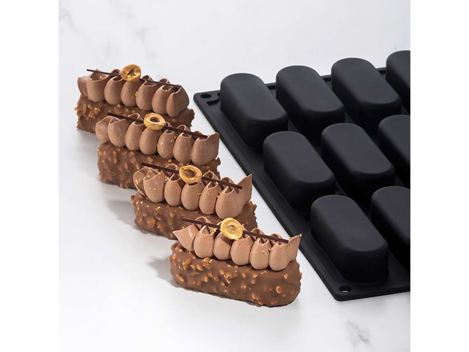 Silikoneformen måler 300x175 mm og har en højde på 21 mm. De 12 individuelle forme måler hver 80x27x21 mm med en kapacitet på 40 ml per form. Den vejer 300 gram og er fremstillet i sort fødevaregodkendt silikone, der både er holdbart og fleksibelt. Formens design er skabt til at give optimal afkøling og varmefordeling, hvilket sikrer jævn bagning og hurtigere afkøling.