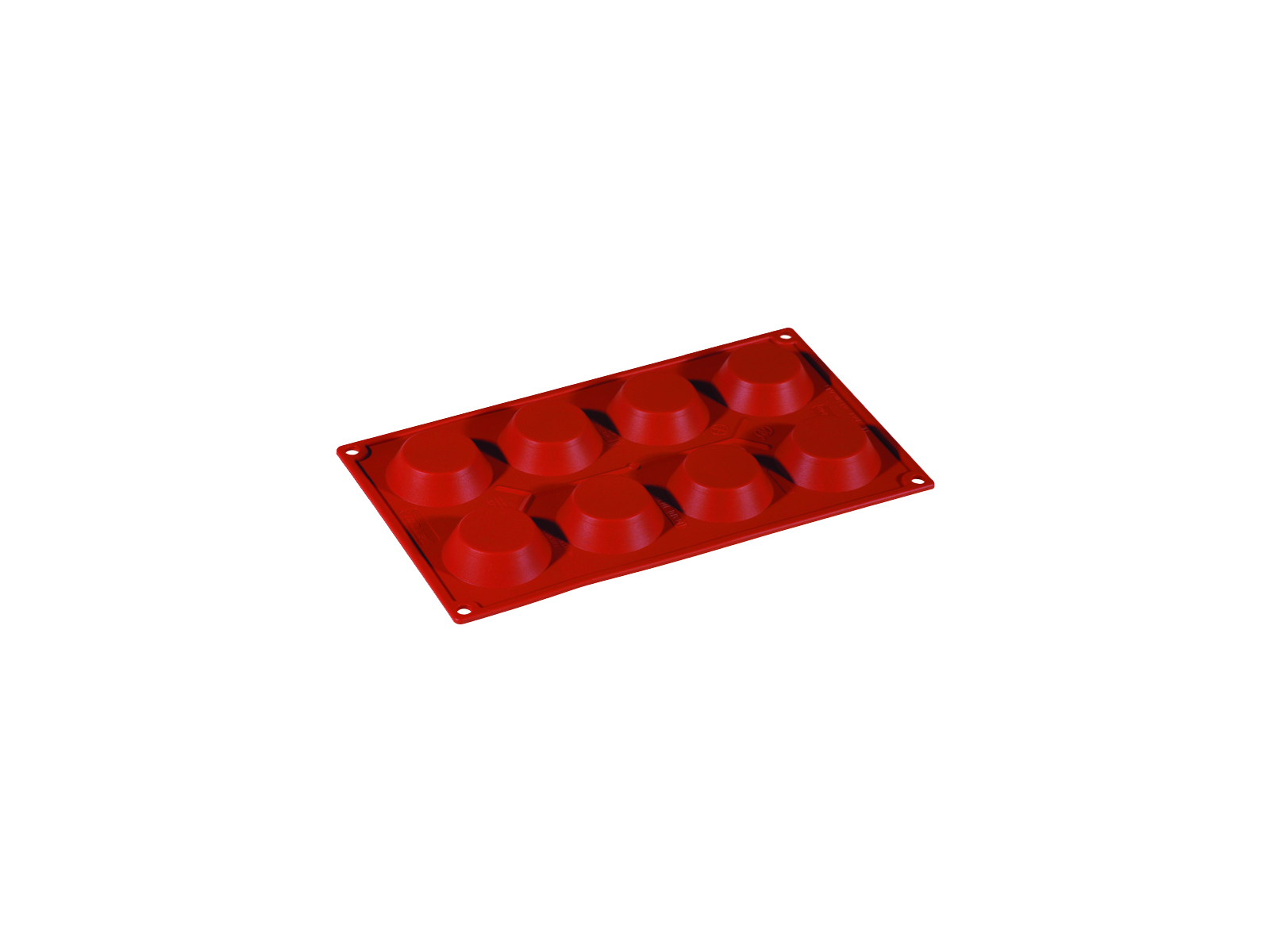 Formens samlede dimensioner er 175 x 300 x 17 mm, og den vejer 300 gram. De 8 fordybninger har hver især en diameter på 60 mm og en dybde på 17 mm med et volumen på 35 ml pr. fordybning. Materialet er fødevaregodkendt silikone i en flot rød farve, der både er praktisk og giver et professionelt udtryk i køkkenet.