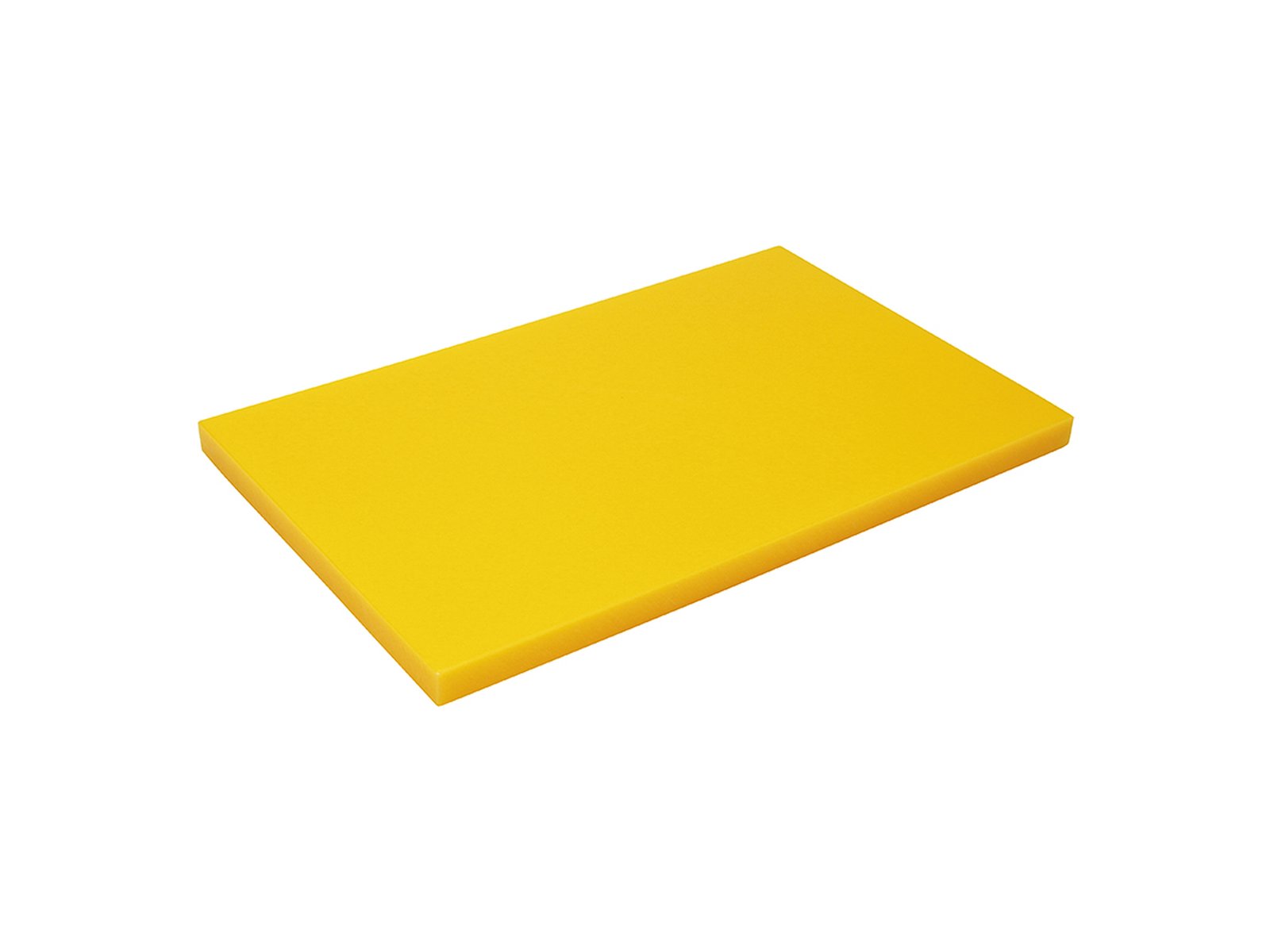 Dette gule skærebræt i holdbar polyd-plast giver dig en solid og stabil arbejdsflade til din daglige madlavning. Med målene 40x25x2 cm har du god plads til at håndtere alle typer råvarer, og de praktiske skridsikre dupper sørger for, at brættet bliver liggende præcis hvor du placerer det.