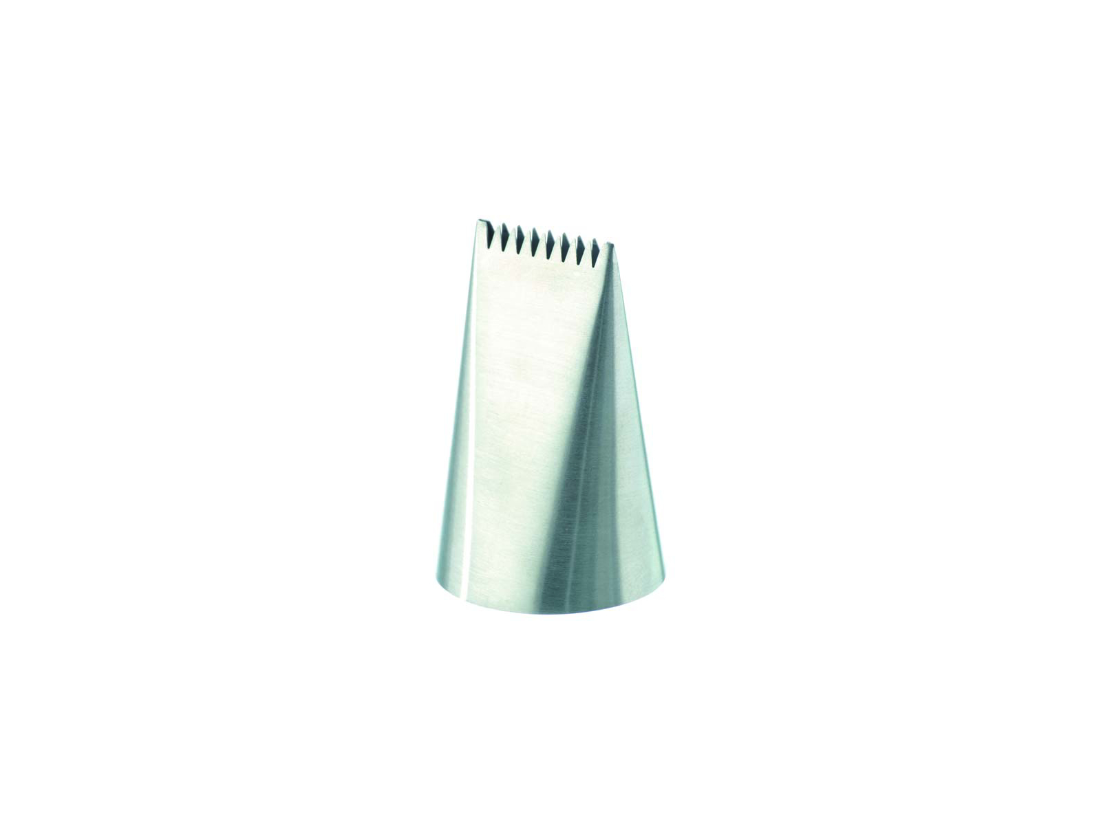 Denne takkede dekorationstylle fra Karl Fritz er fremstillet i holdbart rustfrit stål med målene 12 x 1 mm. Det aflange design med hak sikrer ensartede, professionelle resultater når du arbejder med flødeskum, frosting eller andre konditorkreationer. Tyllen er designet til at passe til alle standard sprøjteposer.