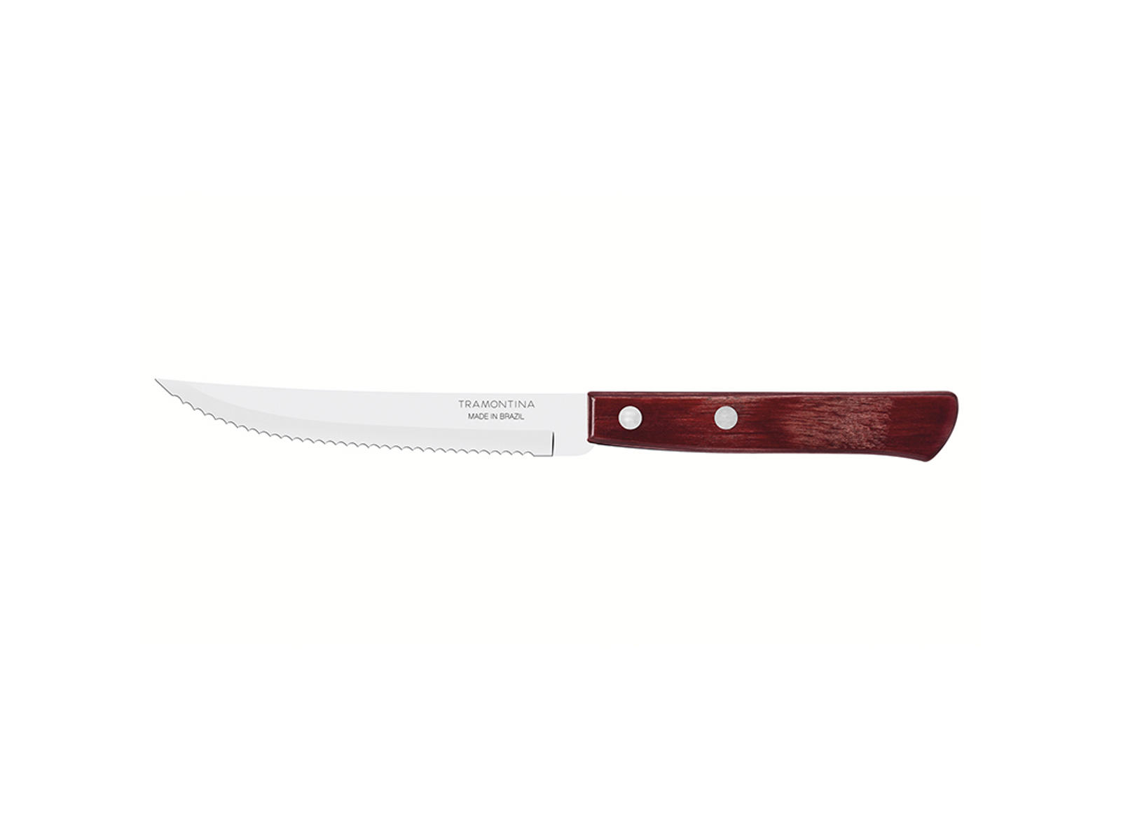 Denne Tramontina steakkniv med 12 cm langt blad i rustfrit AISI 420 stål kombinerer skarphed og holdbarhed i et stilrent design. Det røde Polywood-skæfte giver et sikkert greb, mens de effektive savtakker sikrer præcis udskæring af kød uden at ødelægge teksturen. Ideel til grillmiddage og festlige sammenkomster, hvor både funktion og æstetik spiller en vigtig rolle.