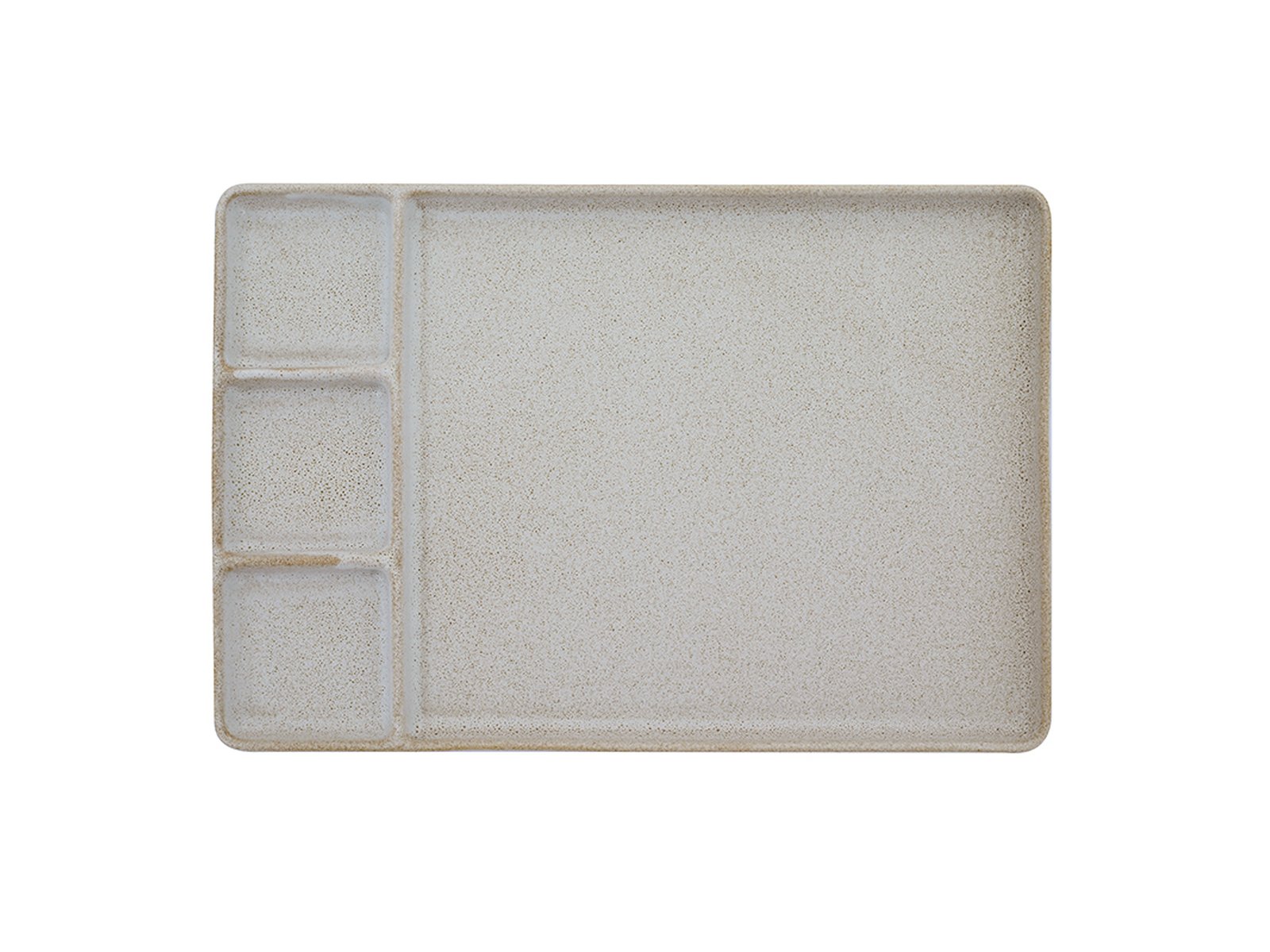 Denne RAW tallerken i stentøj med sandy beige glasur forener nordisk design med gennemtænkt funktionalitet. Den rektangulære form med tre små rum og ét stort giver dig mulighed for at servere flere forskellige retter samtidig, mens den håndlavede finish sikrer et unikt udtryk hver gang.