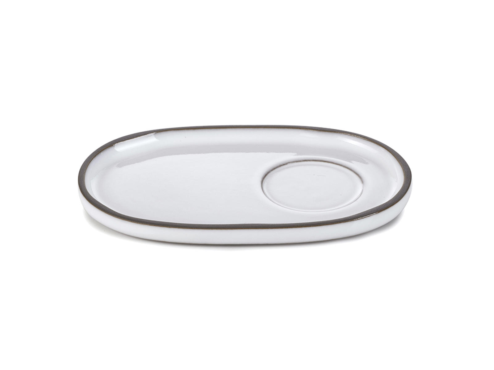Denne ovale underkop fra Revol's Caractere-serie er fremstillet i hvid porcelæn med naturlige konturer. Med sine præcise mål på 13,5 x 8 x 1,2 cm fungerer den som et stilfuldt fundament for kopper, små anretninger eller som en lille serveringsbakke.