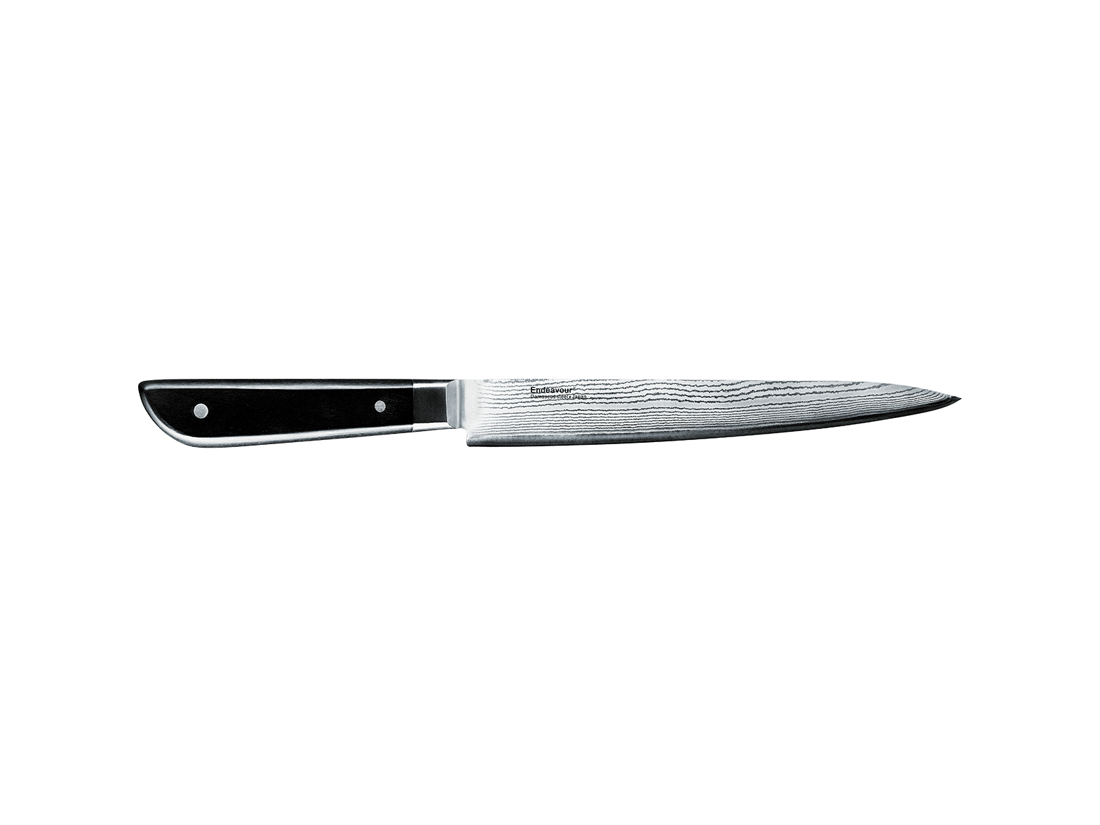 Forskærerkniven fra Endeavours Discovery Pro serie er udviklet til professionel håndtering af kød og fjerkræ. Med sit 20 cm lange, slanke blad i 67-lags damaskussmønstret VG10-stål og ergonomisk pakkatræsskæfte giver kniven dig optimal kontrol og præcision ved udskæring. Den er ideel til at fjerne sener, trimme fedt og skære perfekte skiver af steg.