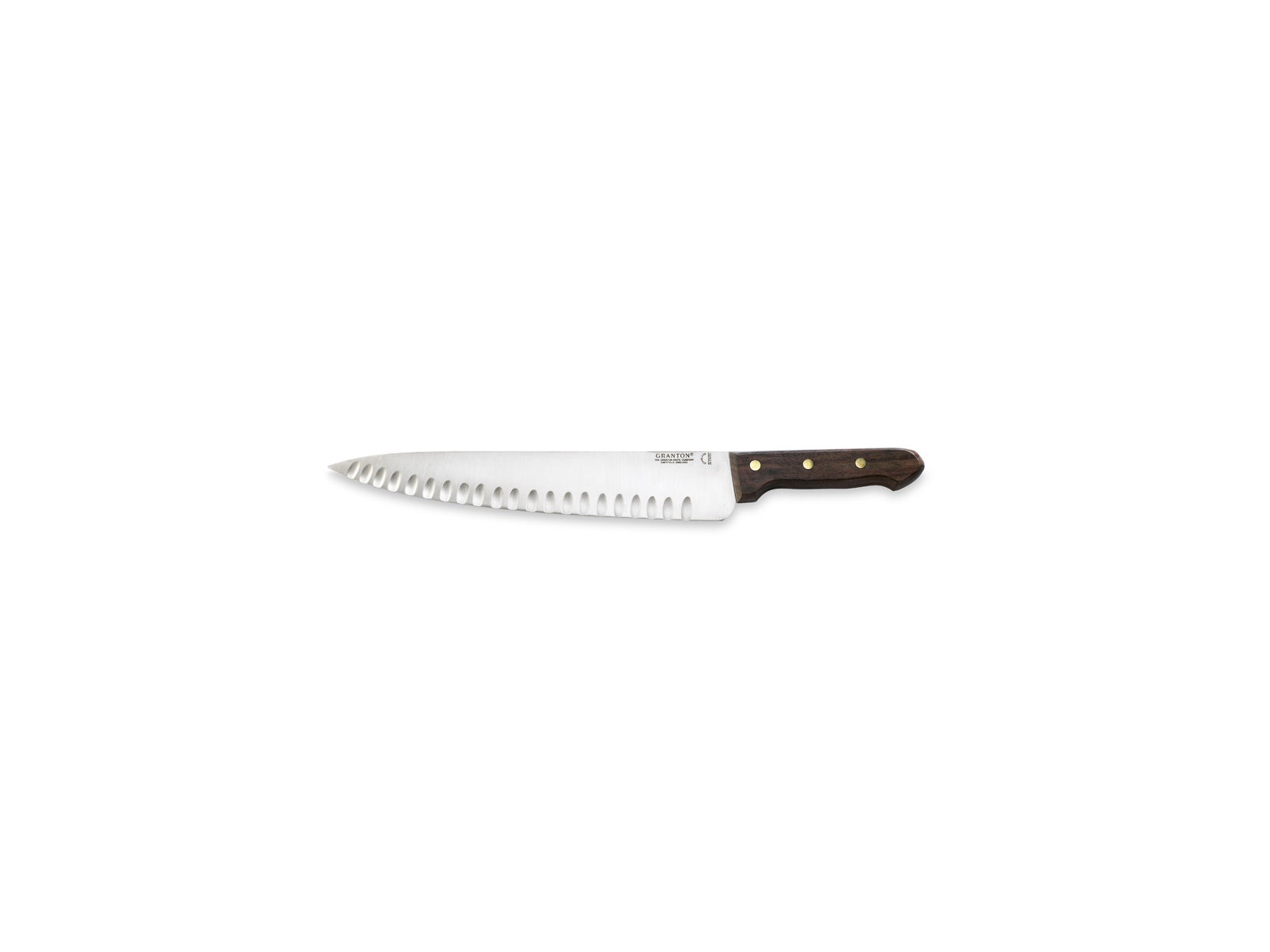 Denne 31 cm Granton trancherkniv med luftskær og træskæfte er et specialværktøj til udskæring af kød, fisk, grøntsager og brød. Det lange blad i Sheffield-stål med innovative luftlommer reducerer friktionen og forhindrer maden i at klæbe til klingen. Ideel til præcisionsskæring ved bordet, hvor perfekte, tynde skiver gør forskellen.