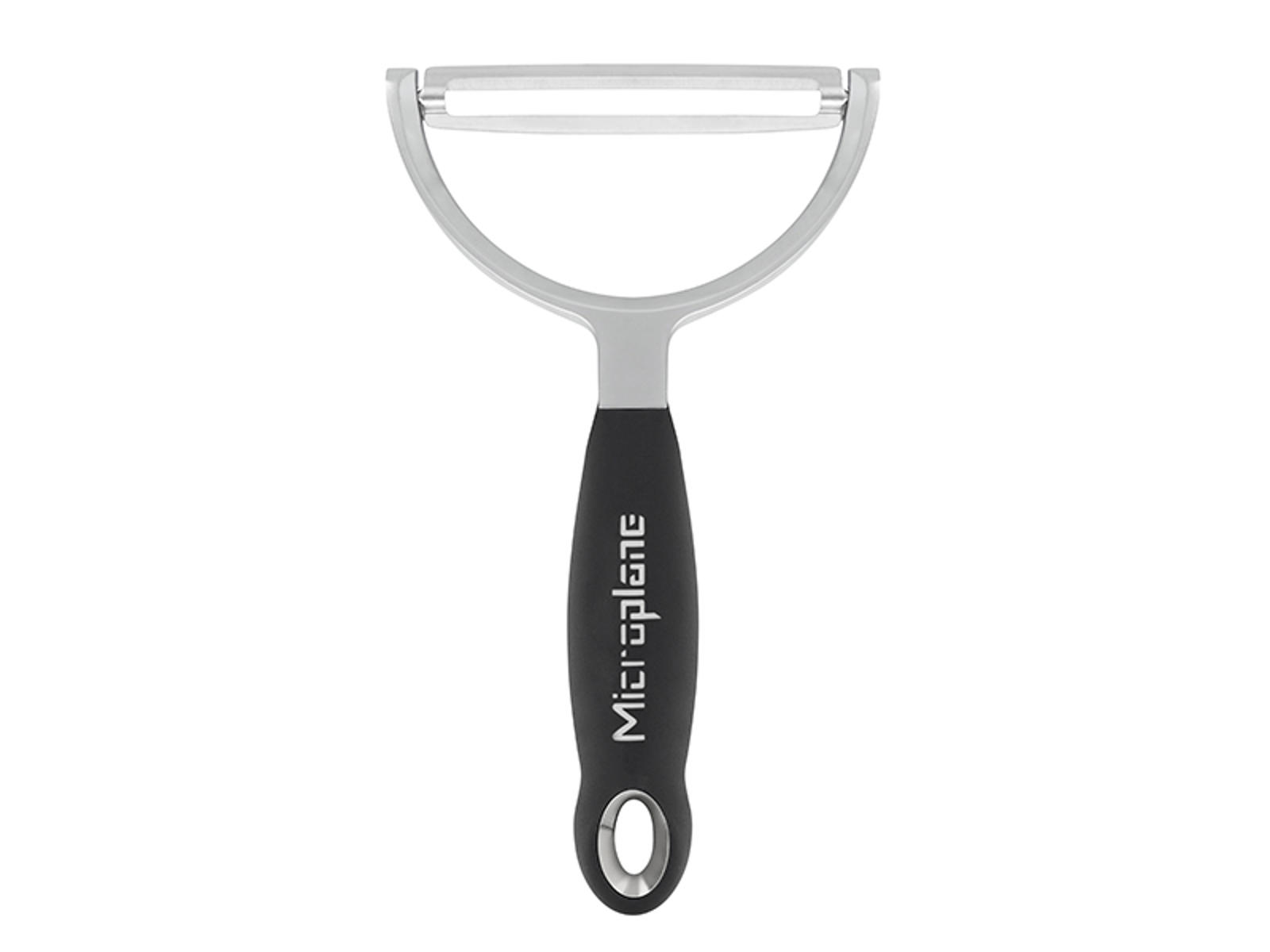 Denne elegante Microplane tyndskræller kombinerer funktionalitet med stilfuldt design. Med sin brede skæreflade og skarpe stålklinge fjerner den skrællen jævnt og glat fra frugter og grøntsager, mens den samtidig bevarer næringsstoffer og smag. Den sorte finish giver skrælleren et moderne udtryk, der passer ind i ethvert køkken.