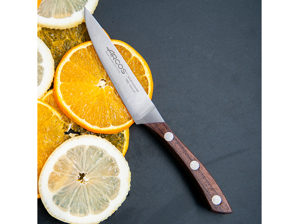 Klingen i NITRUM® rustfrit stål er Arcos' egen patenterede stållegering, som giver kniven exceptionelle egenskaber. Dette specialudviklede stål sikrer, at kniven holder sig skarp i længere tid, modstår korrosion bedre og har en generelt længere levetid end standardknive. Det ergonomiske skæfte i massivt rosentræ er ikke kun smukt at se på, men giver også et godt greb, der ligger naturligt i hånden. Rustfri stålnitter forbinder klinge og skæfte for maksimal stabilitet.