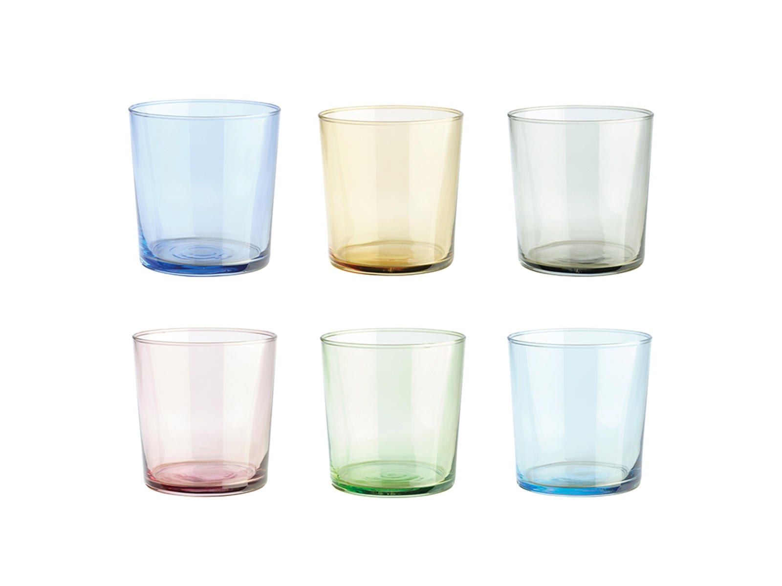 Sættet indeholder 6 glas i forskellige farver, der giver en flot farvesammensætning til bordet.